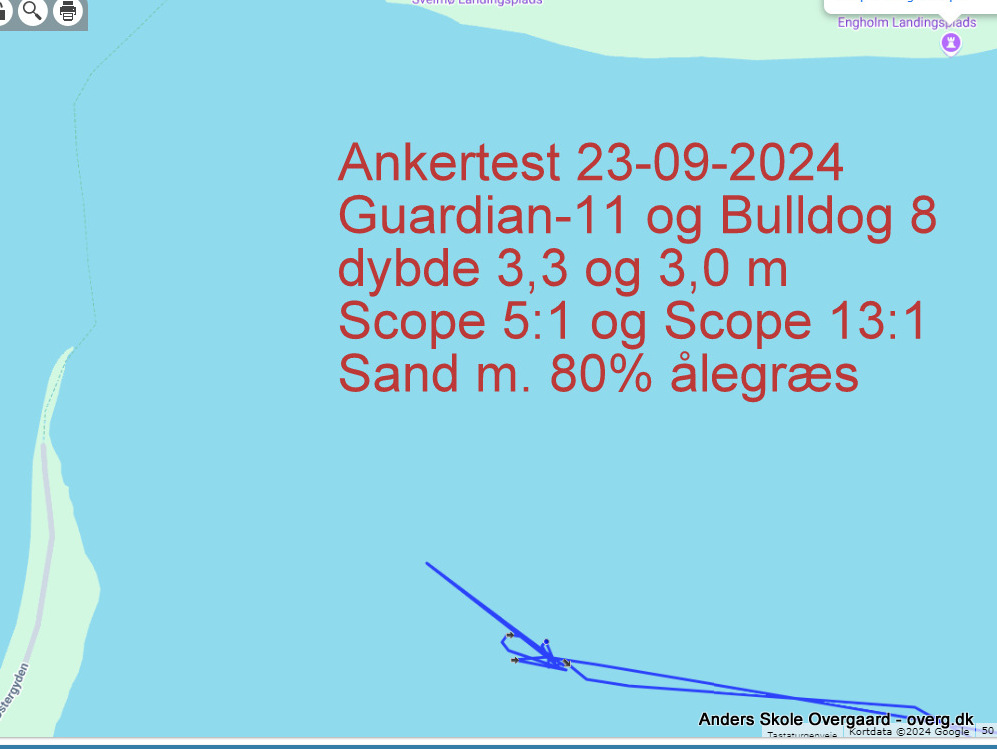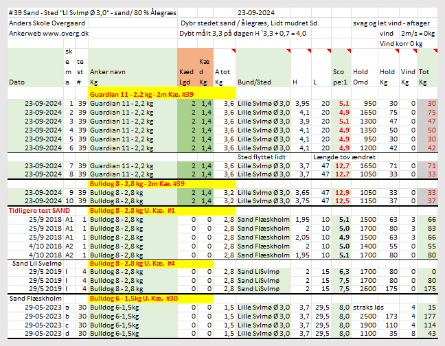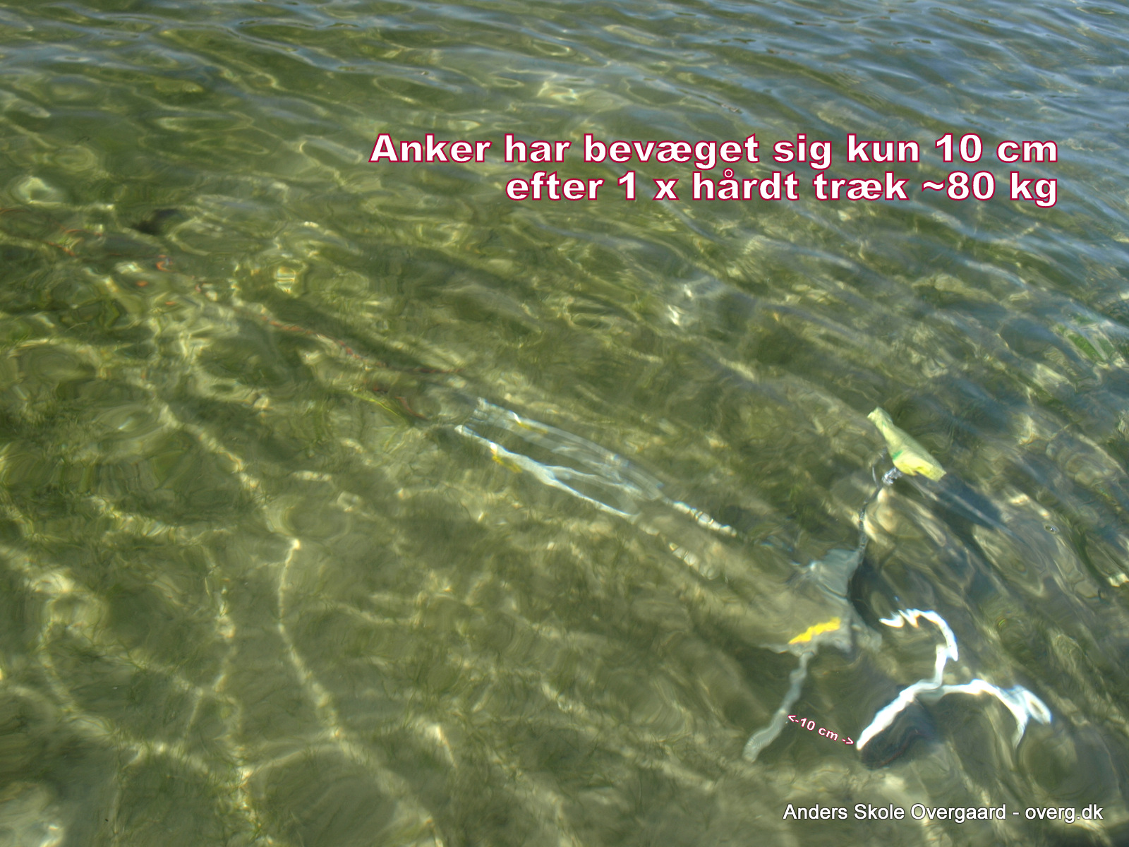 Min vurdering er, at et anker på kun 2-3 kg er for let til at trænge dybt i bundmaterialet hver eneste gang, derfor bliver resultaterne svingende.