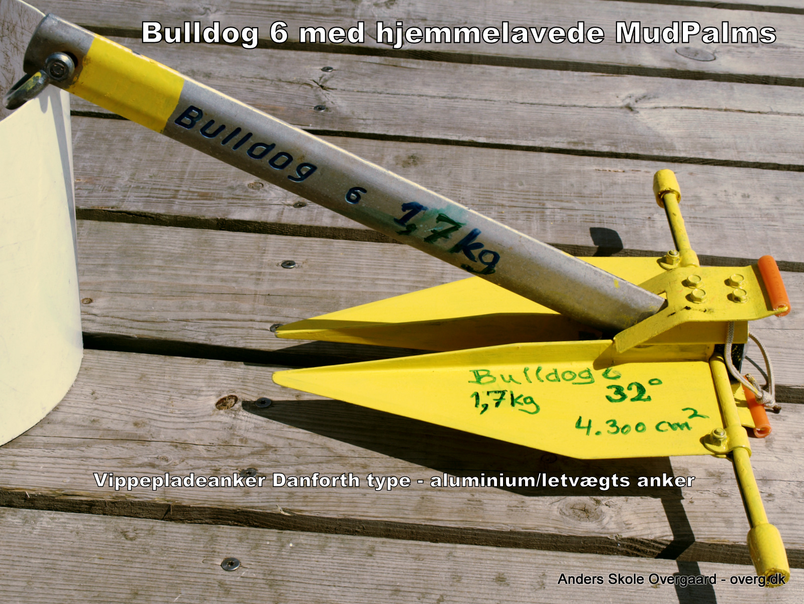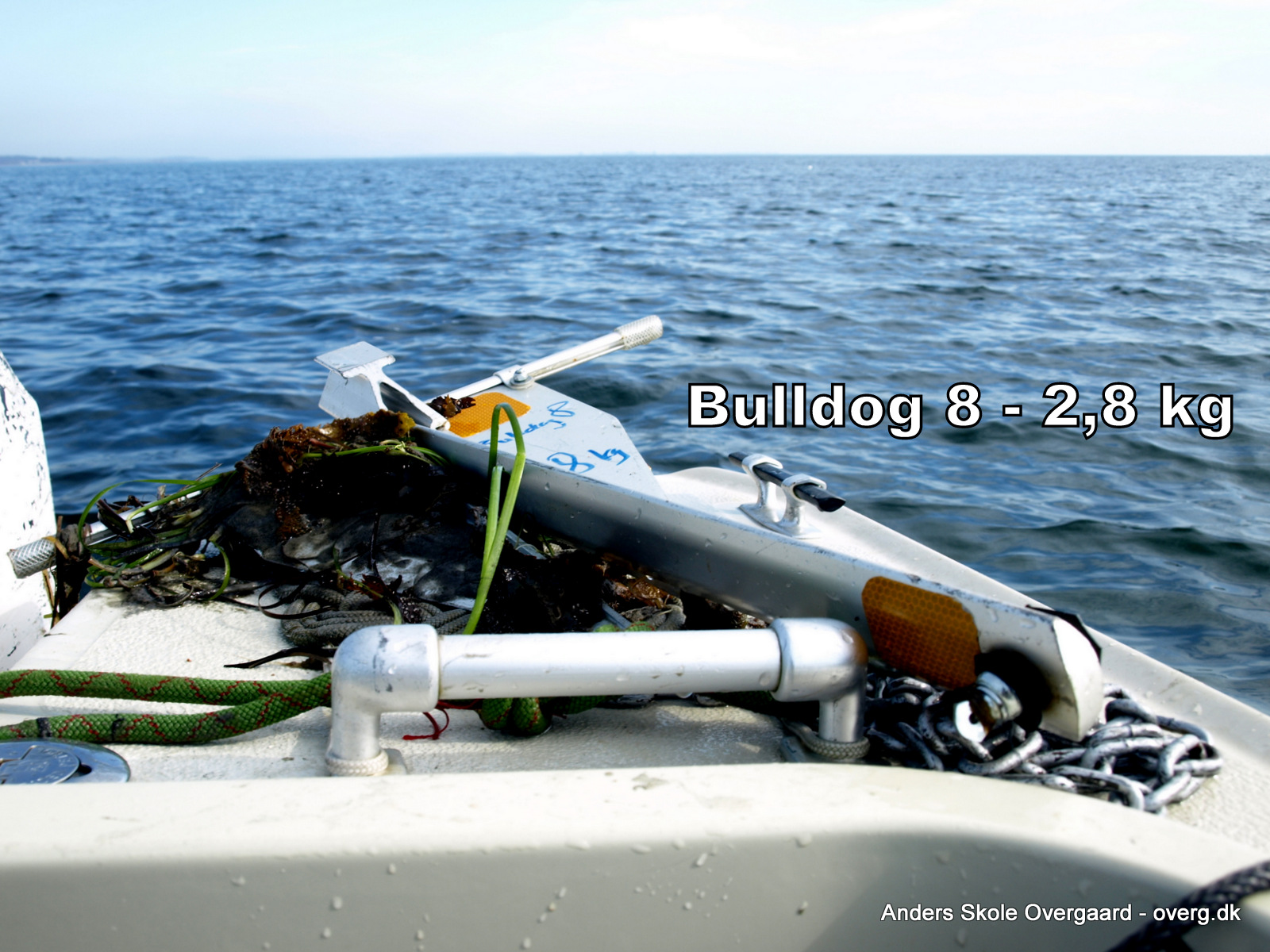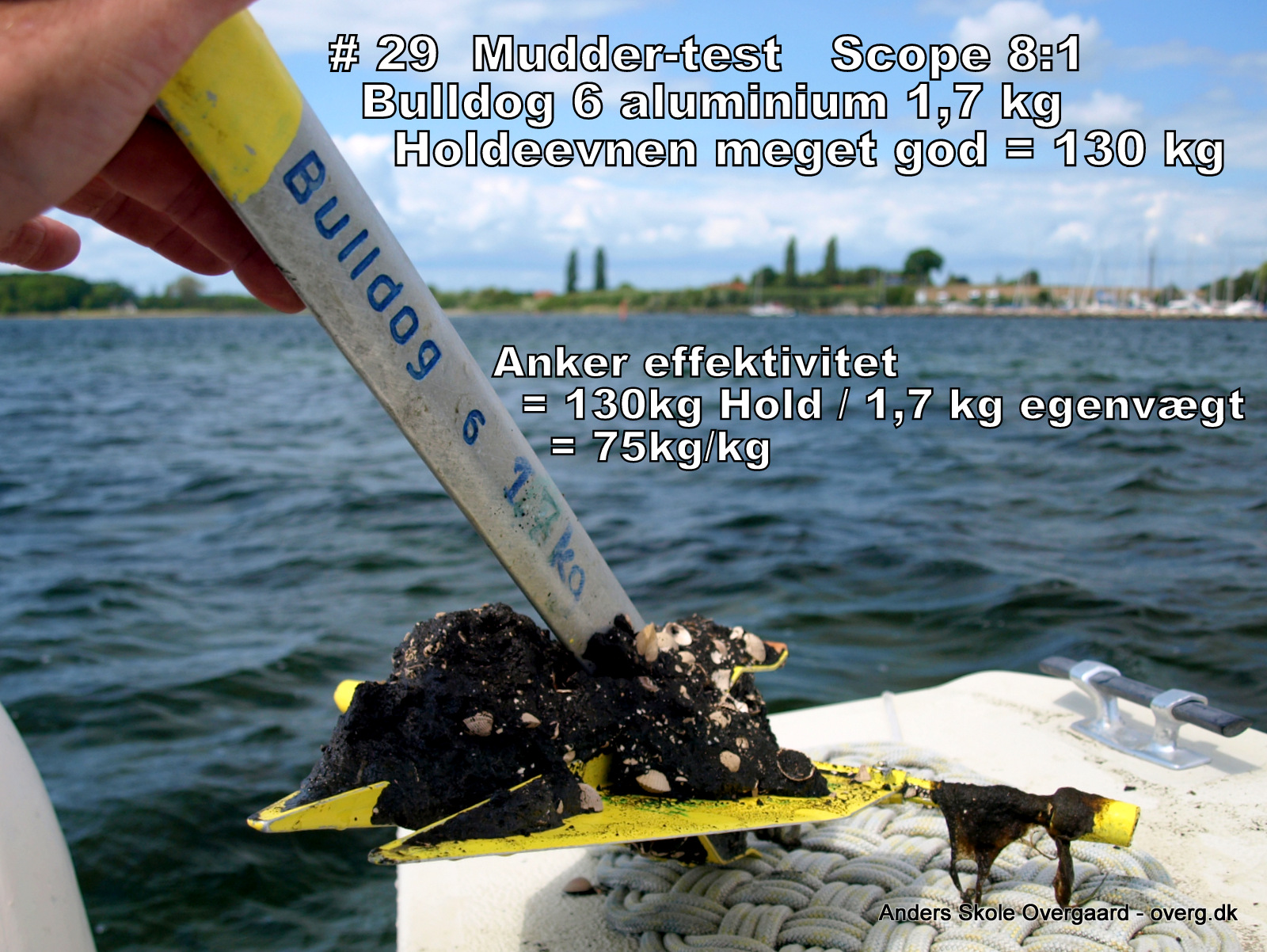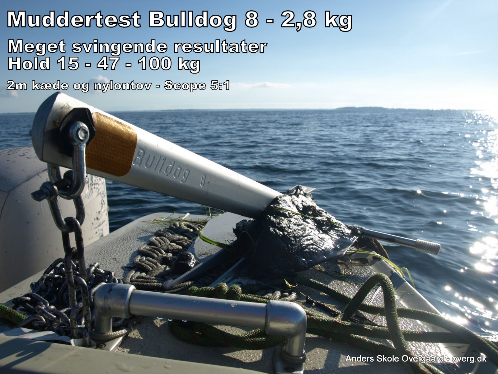 TIDLIGERE ankertest i blødt mudder: Bulldog 8 (2,8 kg) med vinkel 32º har systematisk holdeevne på 160-175 kg Bulldog 6 (1,5 kg) med vinkel 32º har holdevne på 132-135 kg.