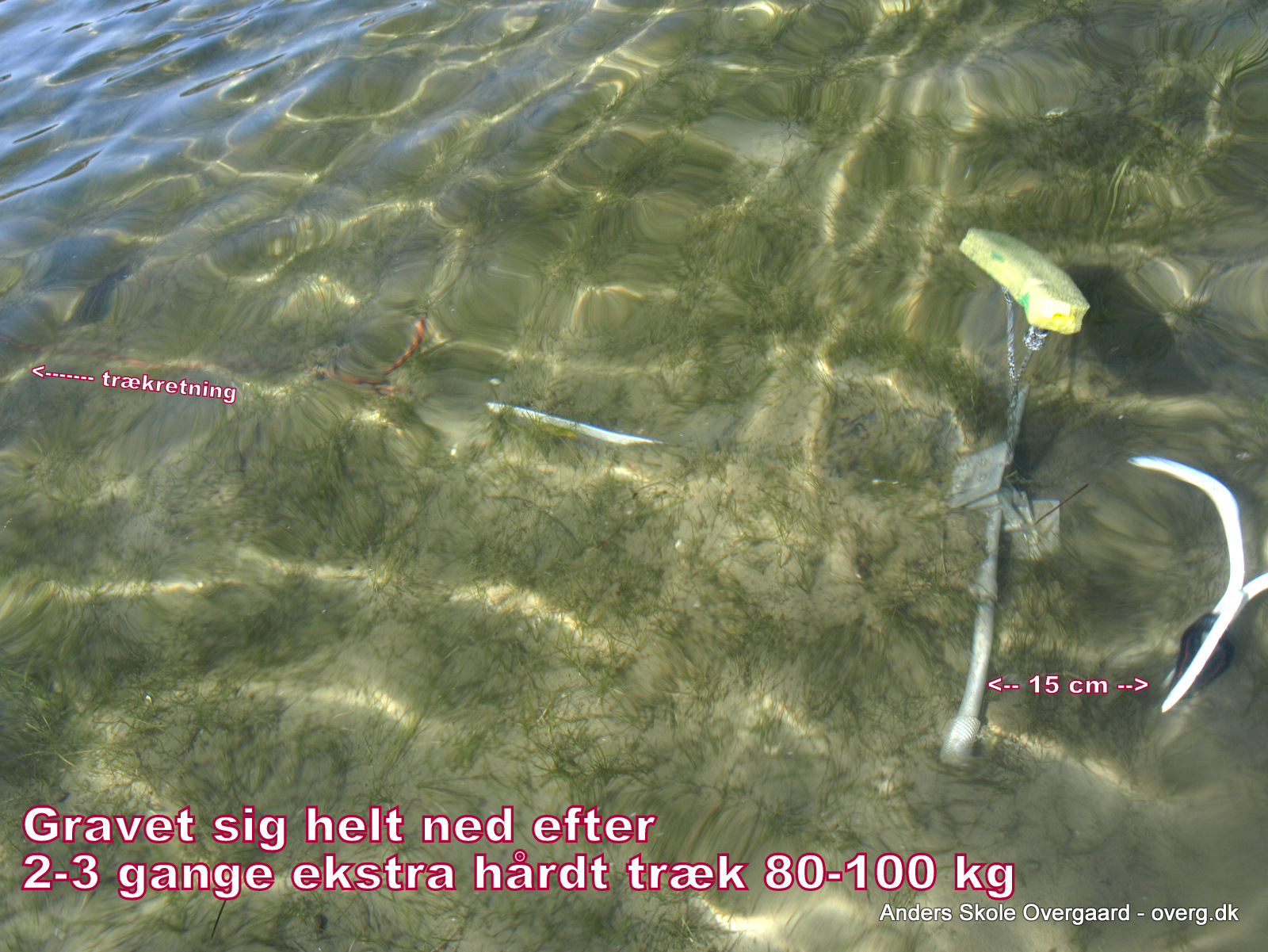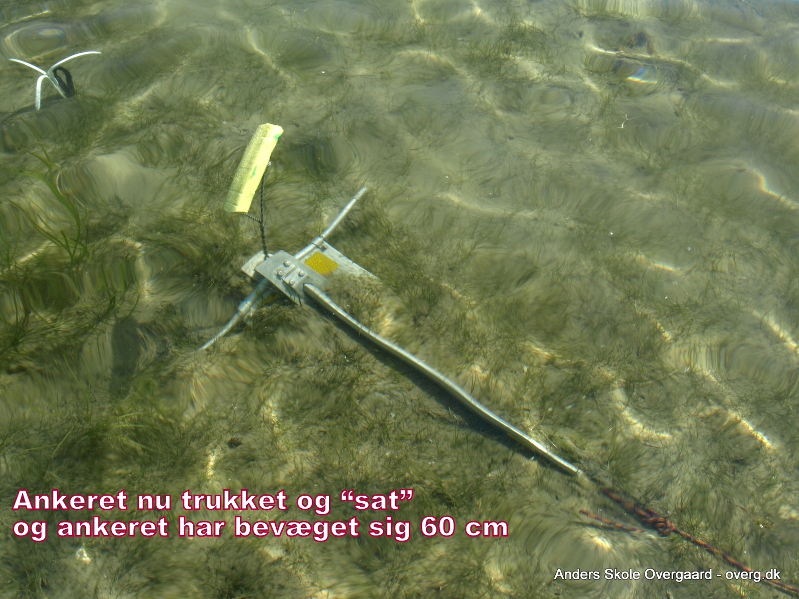 Først “satte” jeg ankeret og observerede, at det flyttede sig 60 cm til det gav stor modstand og var ret godt gravet ned i sandet. (Se billeder i galleriet)