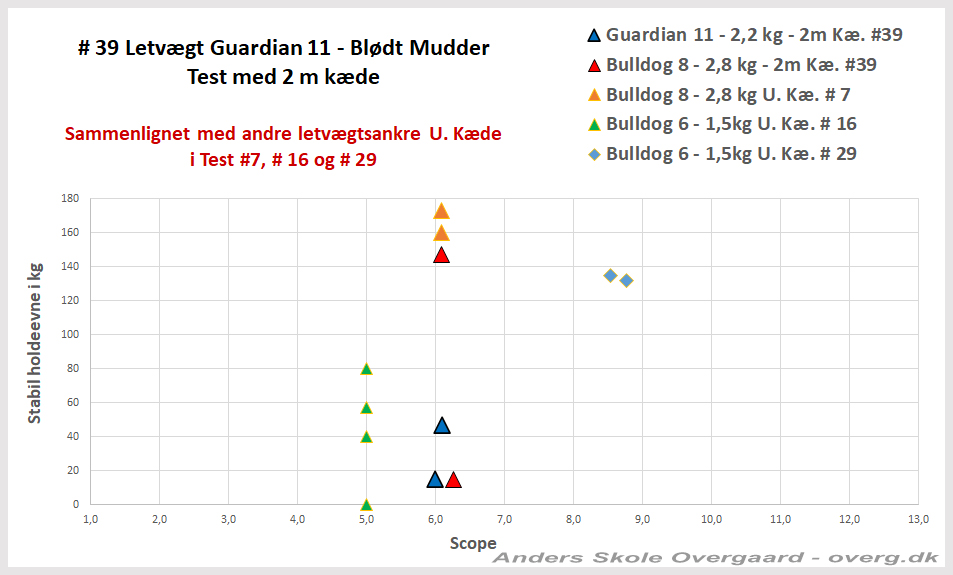 Guardian 11 og andre letvægtsankre. Ankertest i blødt mudder – Graf