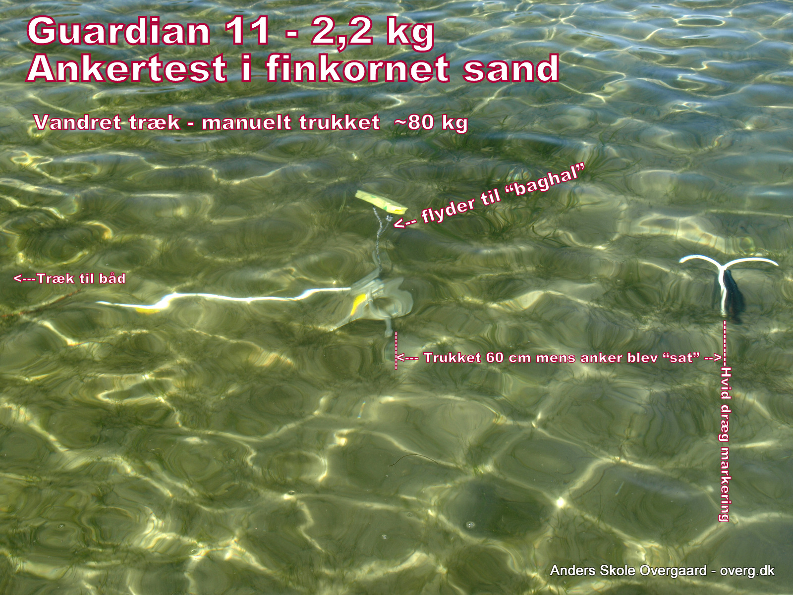 En 27 fod båd vil have et vindpres på 70 kg, i 15 m/s vind, og det kan Guardian 11 altså godt holde, NÅR ankeret har gravet sig godt ned i sand.