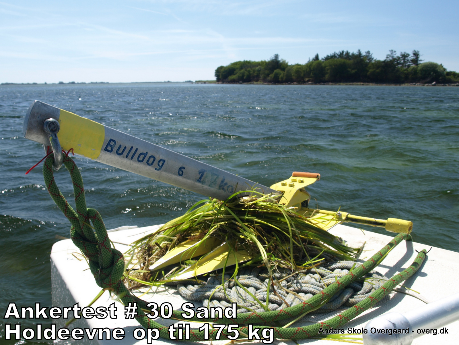 TIDLIGERE ankertest i sand: Bulldog 8 (2,8 kg) KAN give holdeene på 75 kg i sandbund.