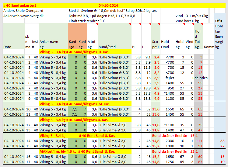Generelt ER resultaterne også svingende for alle ankertest og jeg ville gerne vil lave MANGE FLERE test for tage højde for usikkerheden. MEN ankertest tager bare rigtigt lang tid, jeg brugte for eksempel en hel dag bare for at lave serien med de 17 test i sandbund. Jeg har desværre ikke nået mere i denne sommersæson.