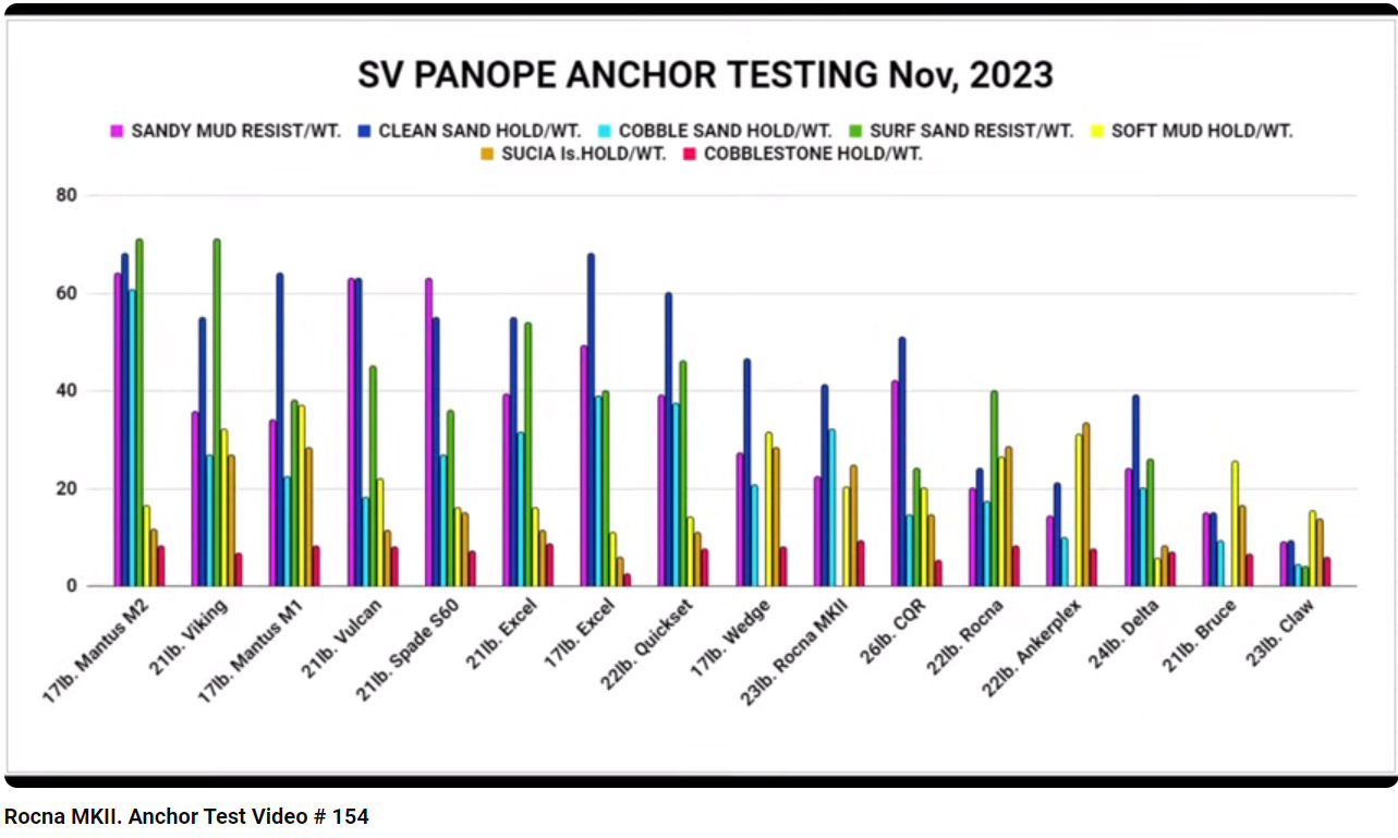 Her har Viking 10 (21lb) Effektivitet ~30 kg/kg eller mere for alle bundtyper UNDTAGET ”Cobblestone” = stenet bund. Men i den bund er der faktisk INGEN ankre der kan holde.
