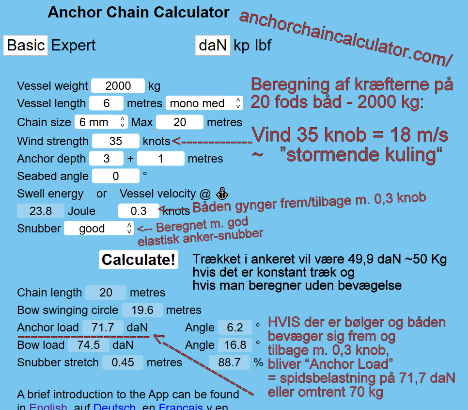 Jeg laver en beregning på Anchor Chain Calculator, og får en VURDERING af, HVOR store kræfterne er på en 20 fods båd.