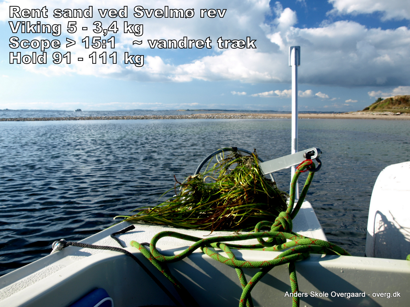 MAXset 4 (4,6kg) gav hold = 69 og 89 kg, hvilket er meget typisk for dette anker i meget god sandbund. Ålegræs kommer efter at ankeret ER gået løs