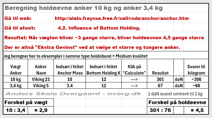 Hans beregning gælder generelt for: ”…For a typical steel anchor of mass M (in kg), whether flat or plough, with no angulation…” så jeg går ud fra, at jeg kan bruge det til direkte sammenligning af to ankre af præcis samme fabrikat med FORSKELLIG størrelse.