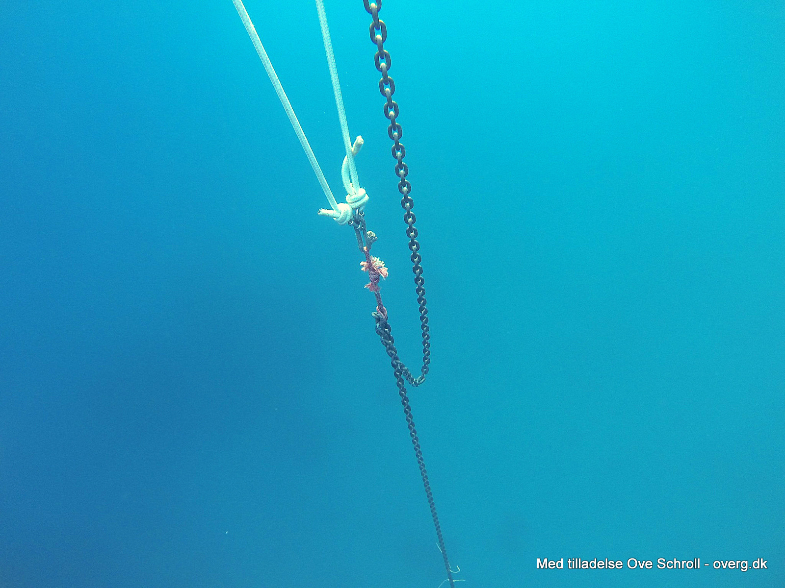 HVIS de to ender går samlet ned og op, er der ikke så meget risiko for slid i kædeleddet. MEN HVIS de to ender går fra en klampe i den ene side, ned og igennem kæden og op til den anden klampe, vi der måske være risiko for slid, hvor linen går igennem kædeleddet.