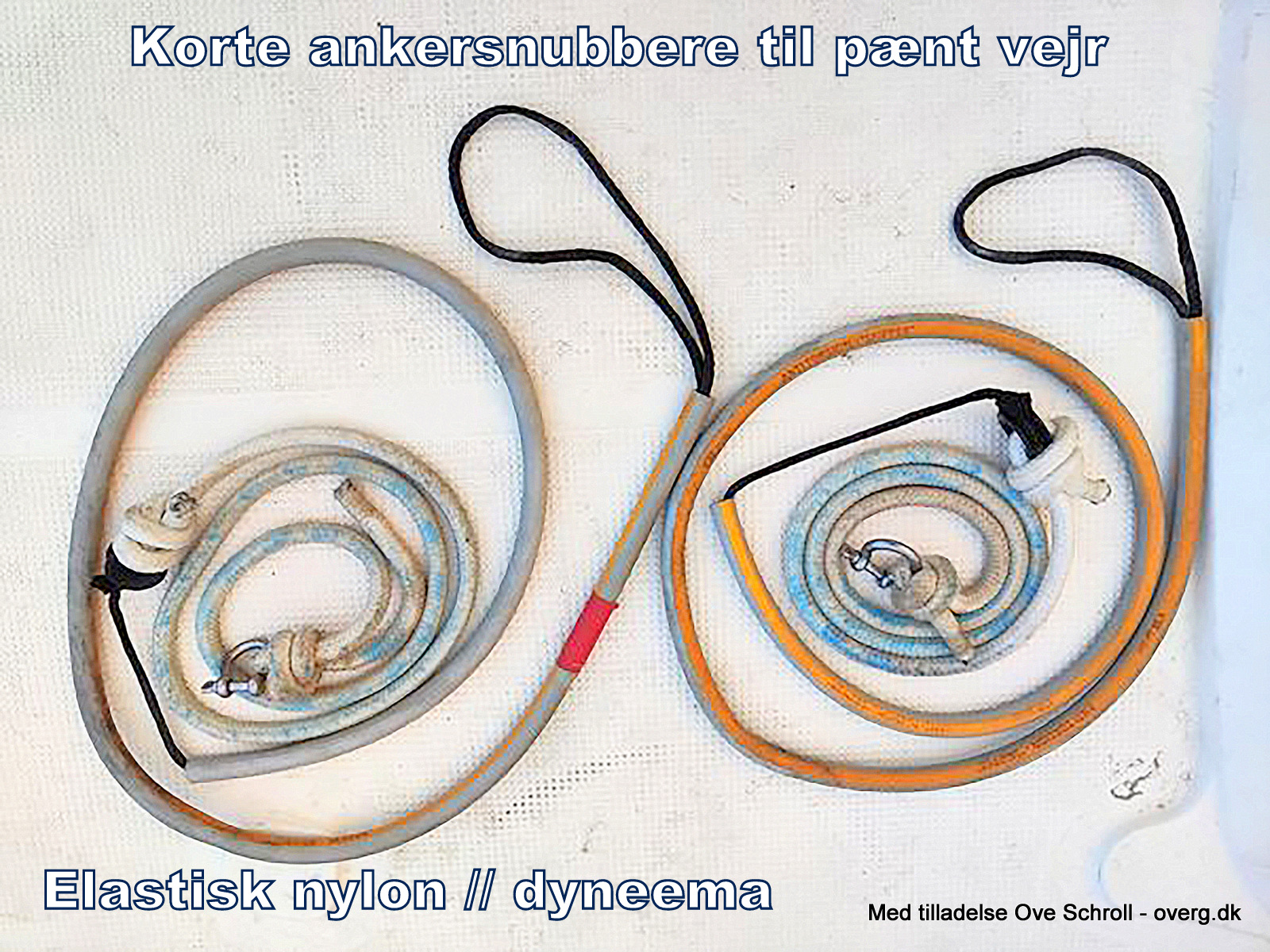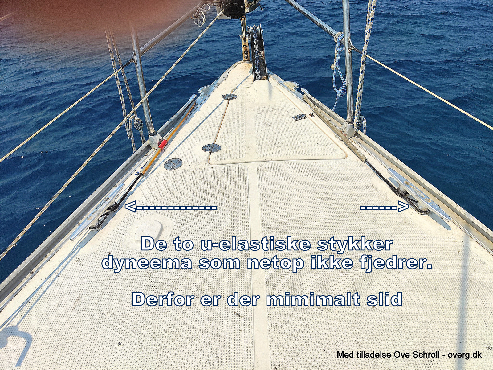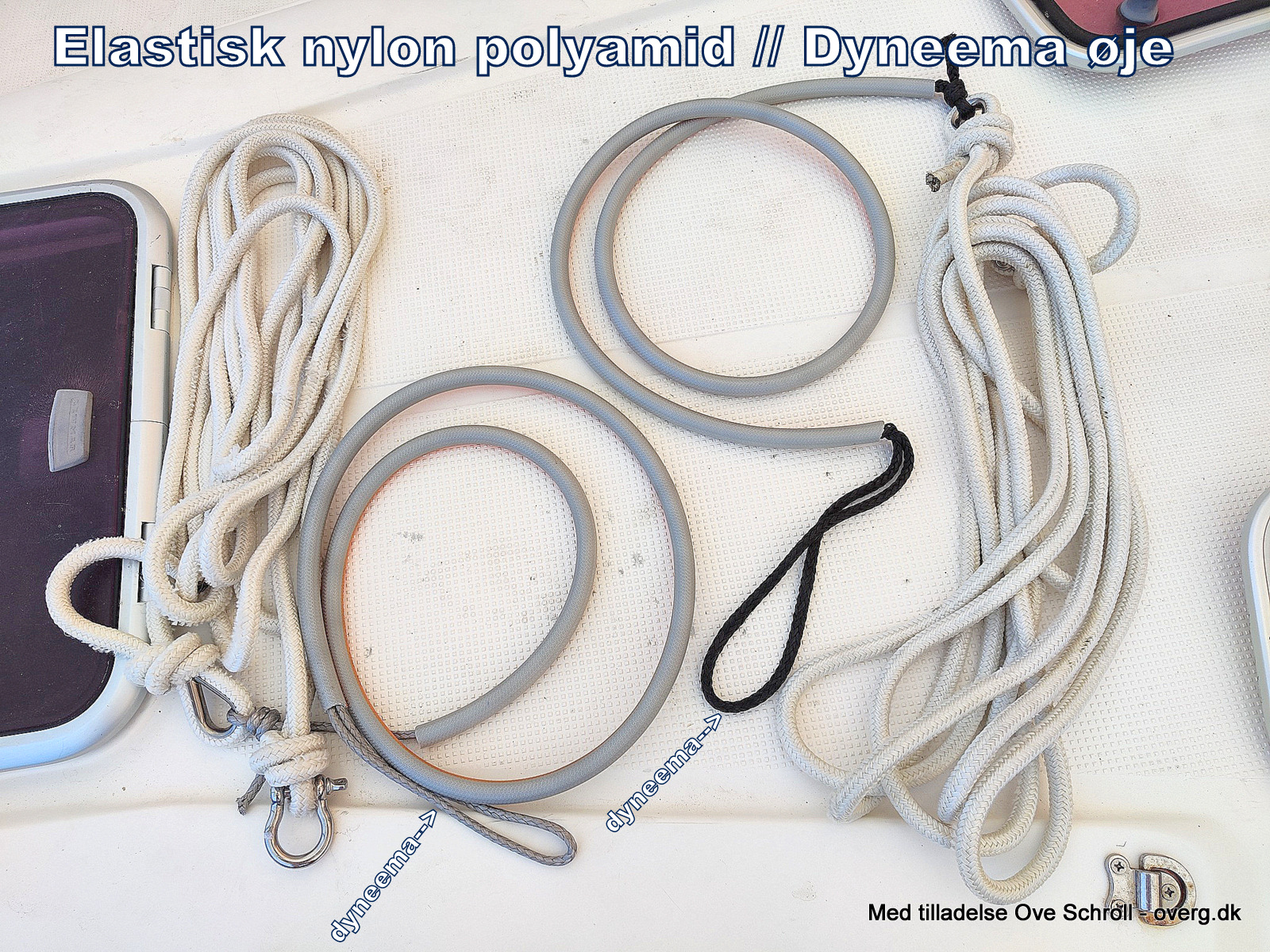 For at undgå slidproblemer er de første par meter af snubberne Dyneema, som overhovedet ikke strækker sig og derfor ikke vil glide i klyssene og gnave på stævnen, som nylontovet gør. Har ideen fra et sejlerblad for over 20 år siden.