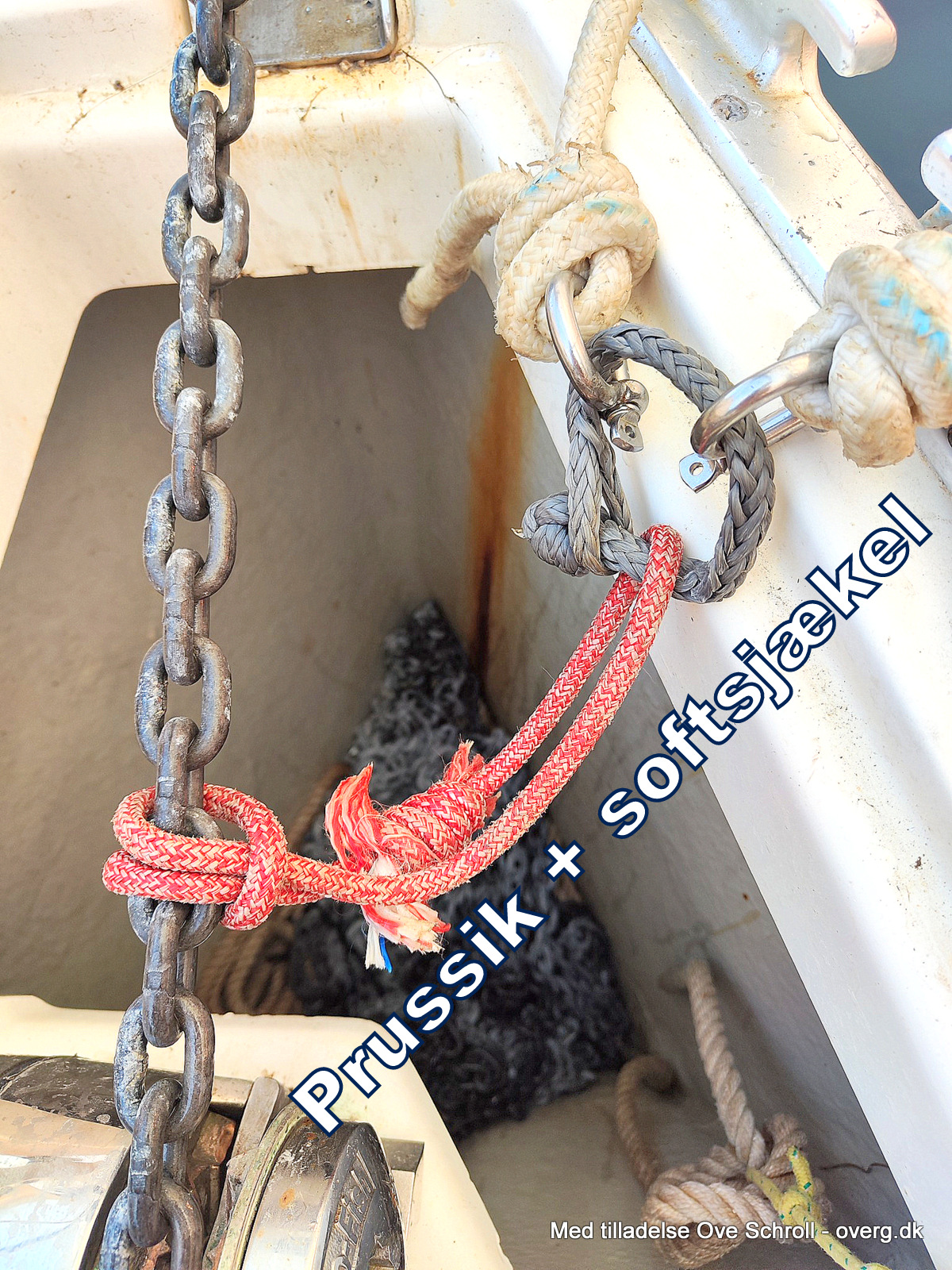 Fordelen ved at bruge en prusik er, at man kan anvende en softsjækel af en ordentlig kaliber i modsætning til en tynd en, der skal gå gennem kæden.