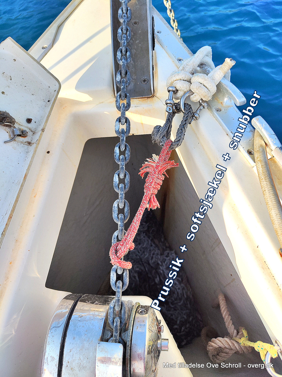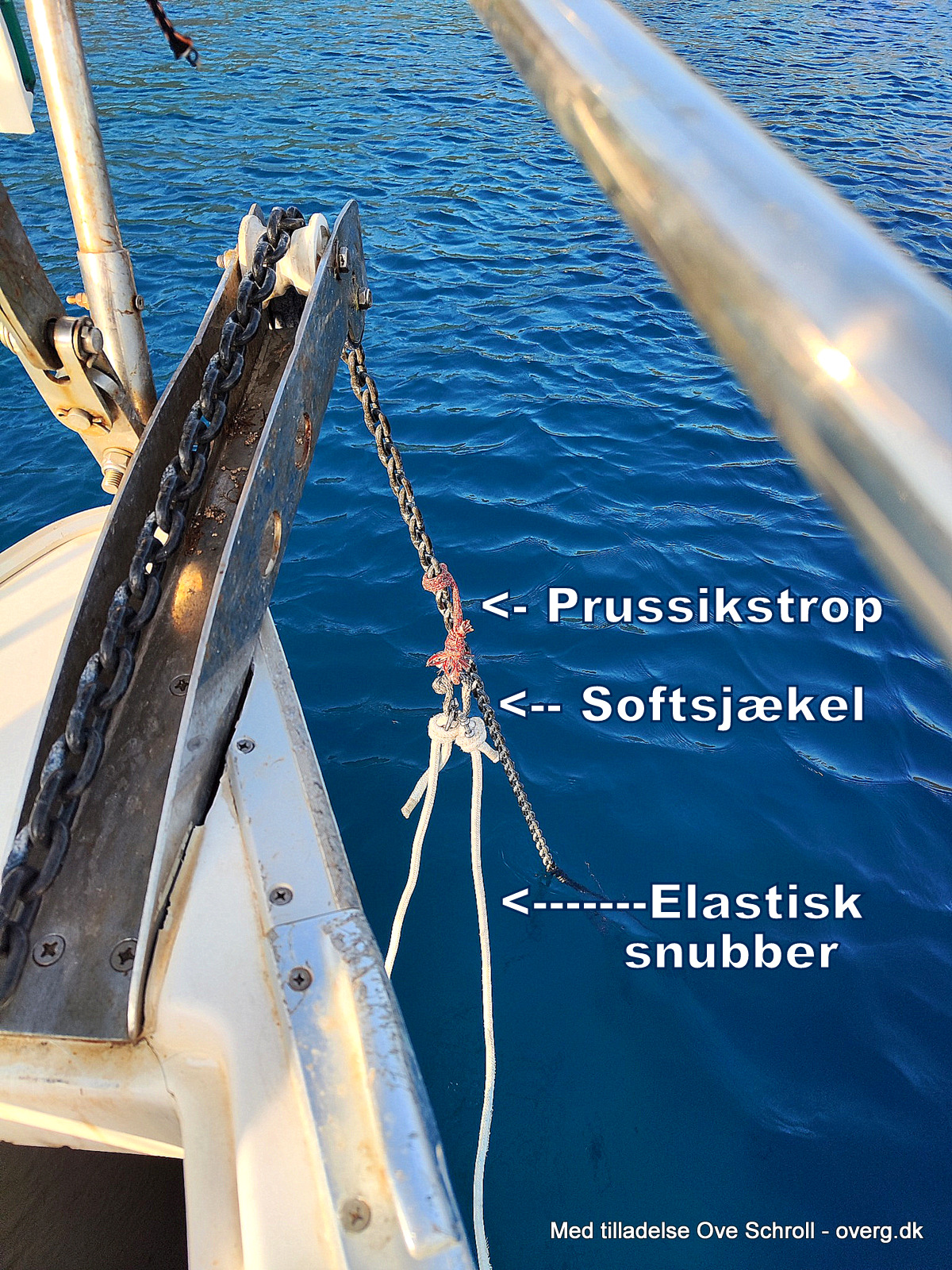 Han har lavet en ankersnubber af 3-slået nylontov, som han sætter på kæden med en softsjækel.