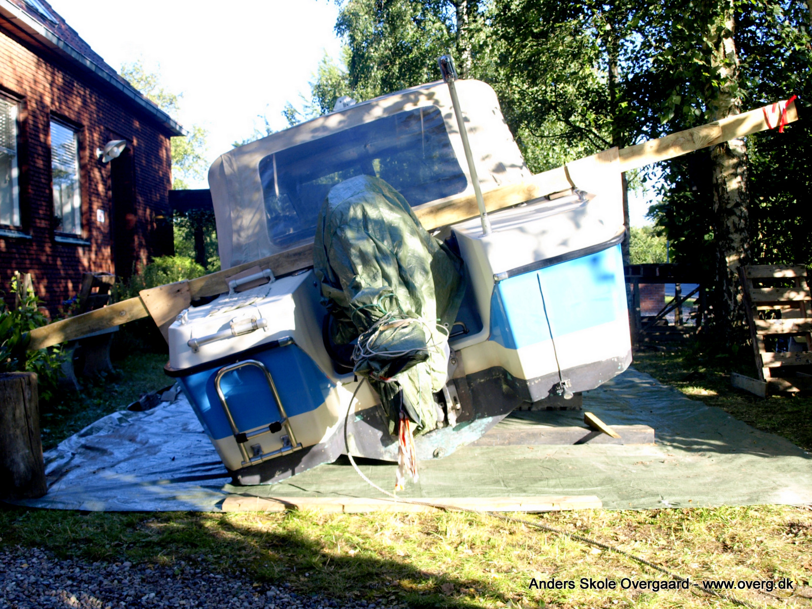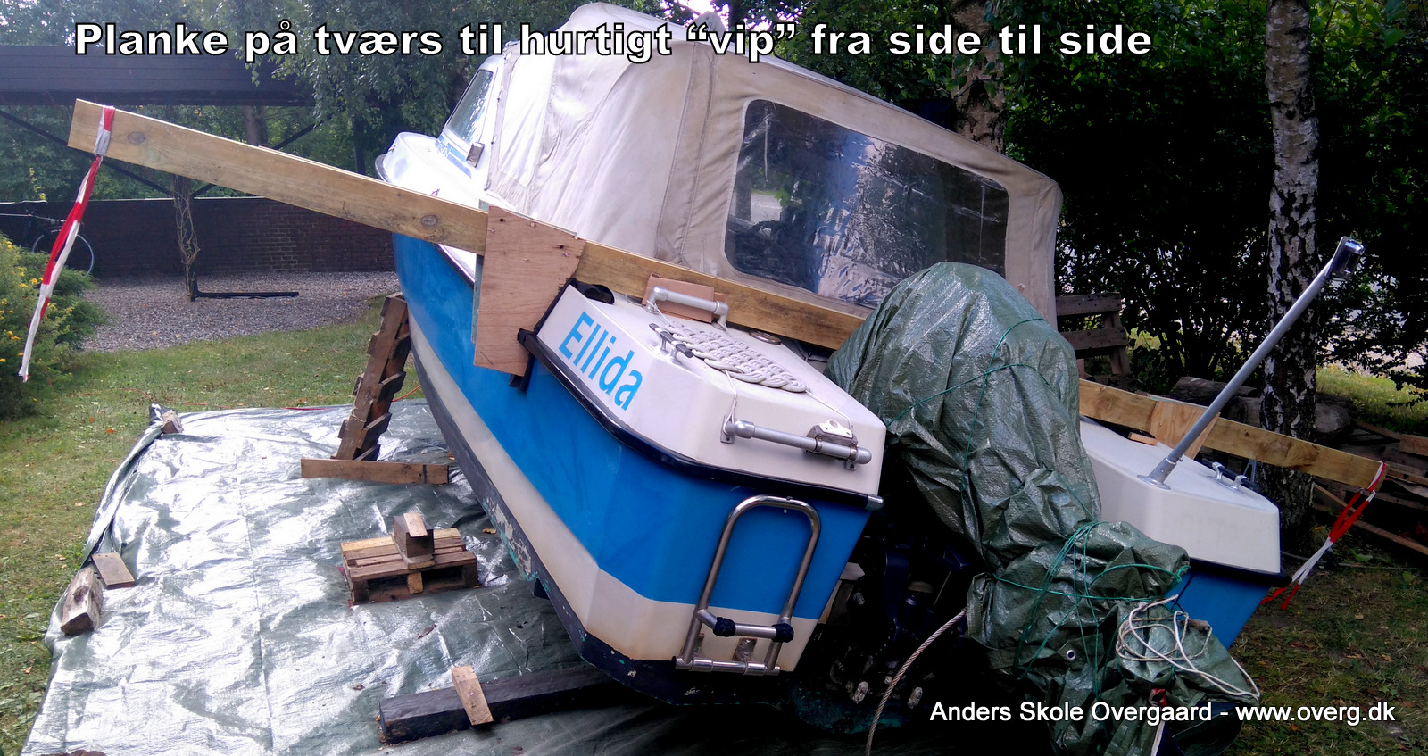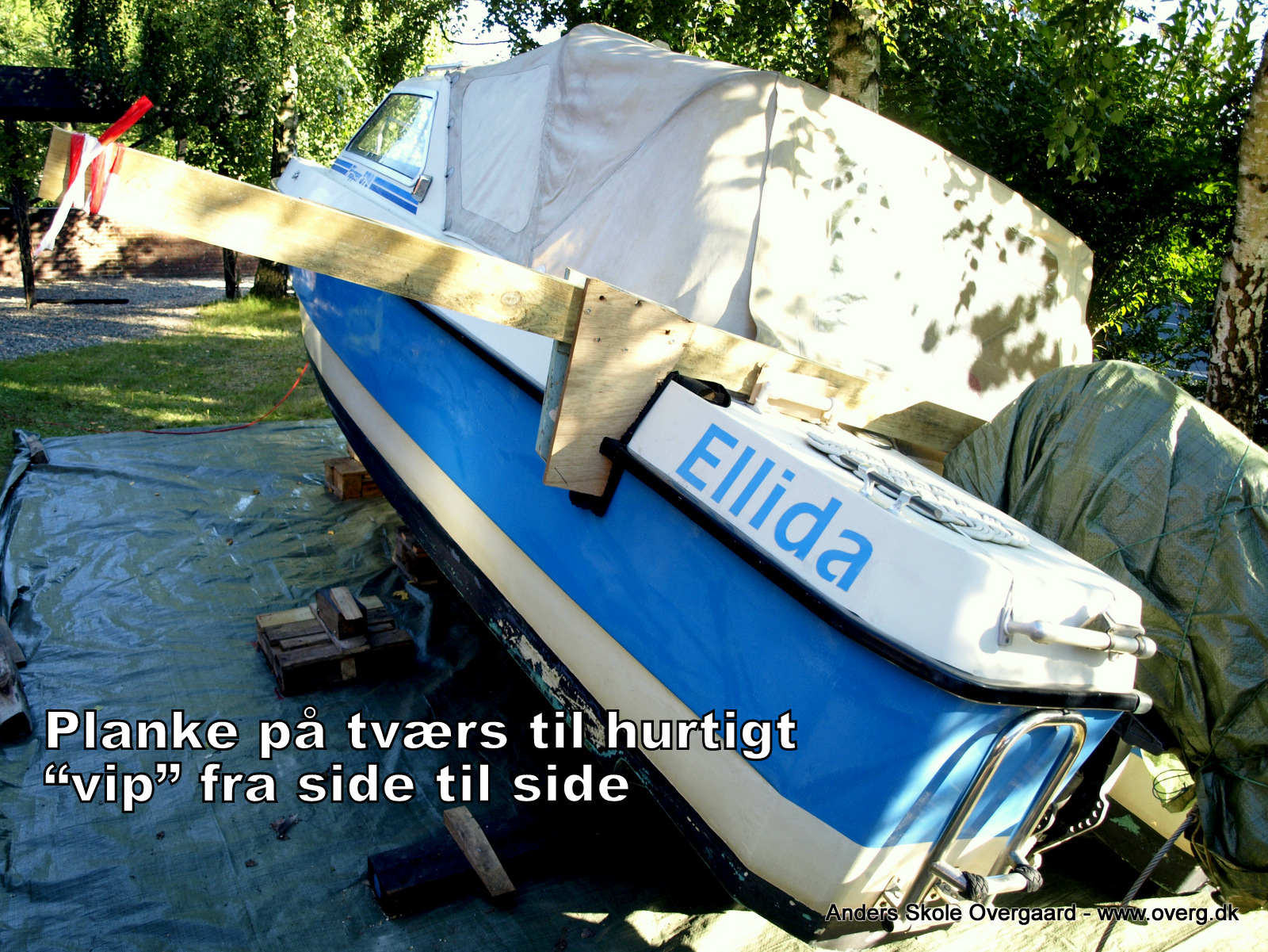 Jeg har klodset båden op og spændt en lang ”vægtarm” på tværs, så det er let at vippe fra side til side. Båden skal jo vippes mange gange.