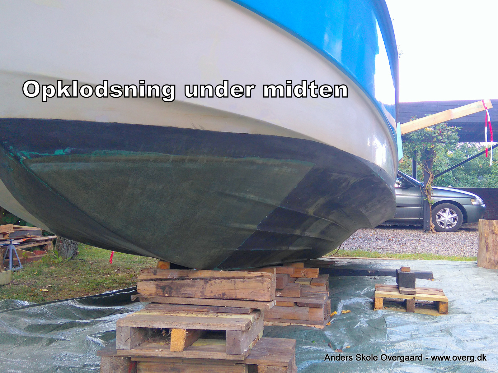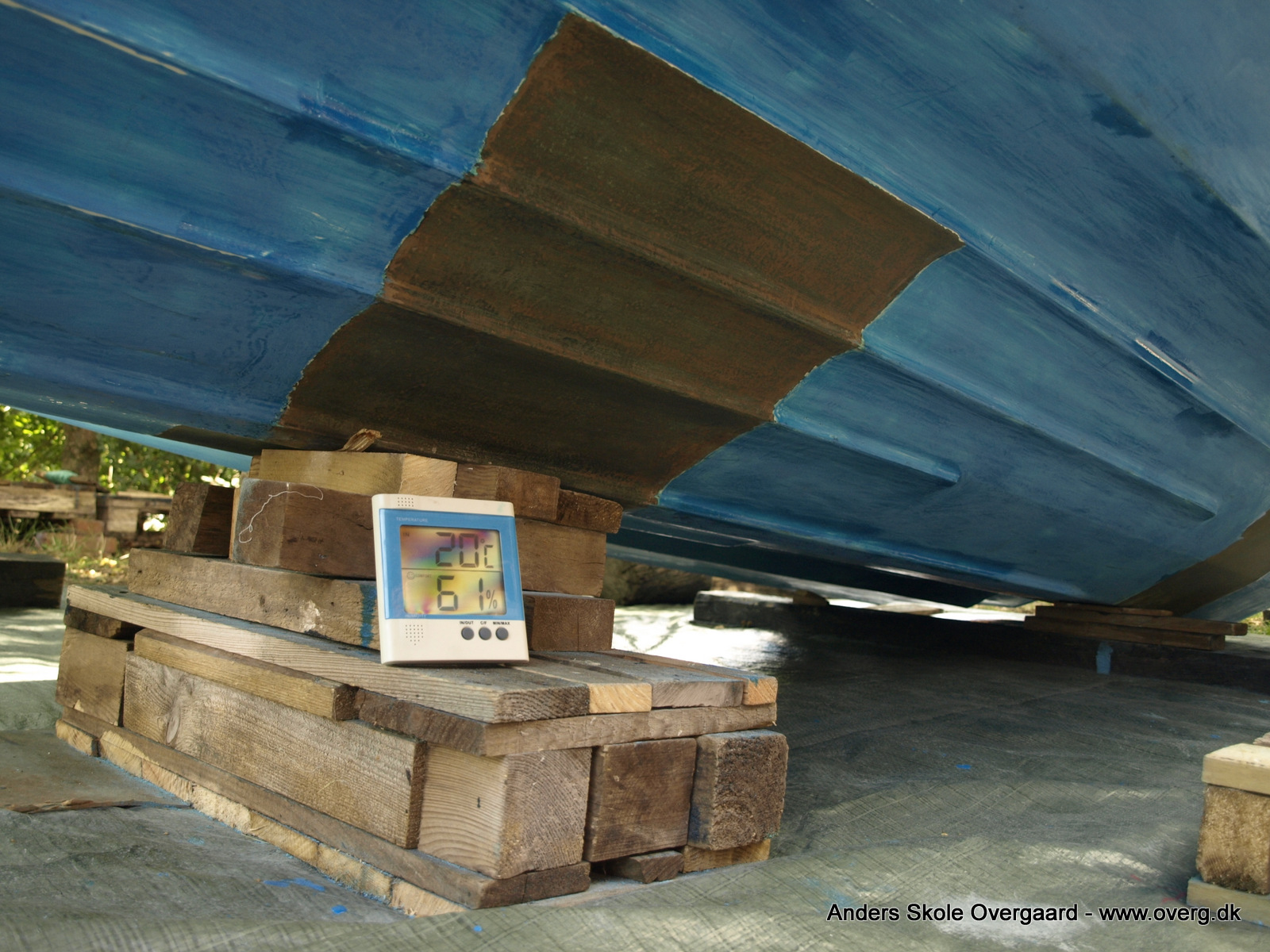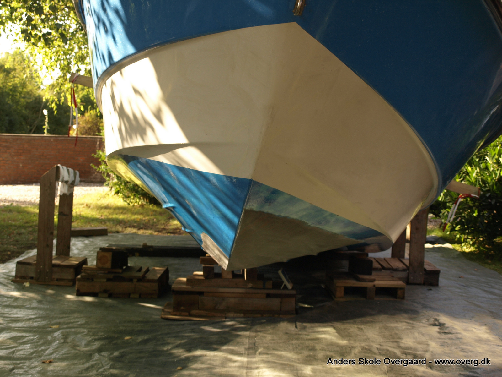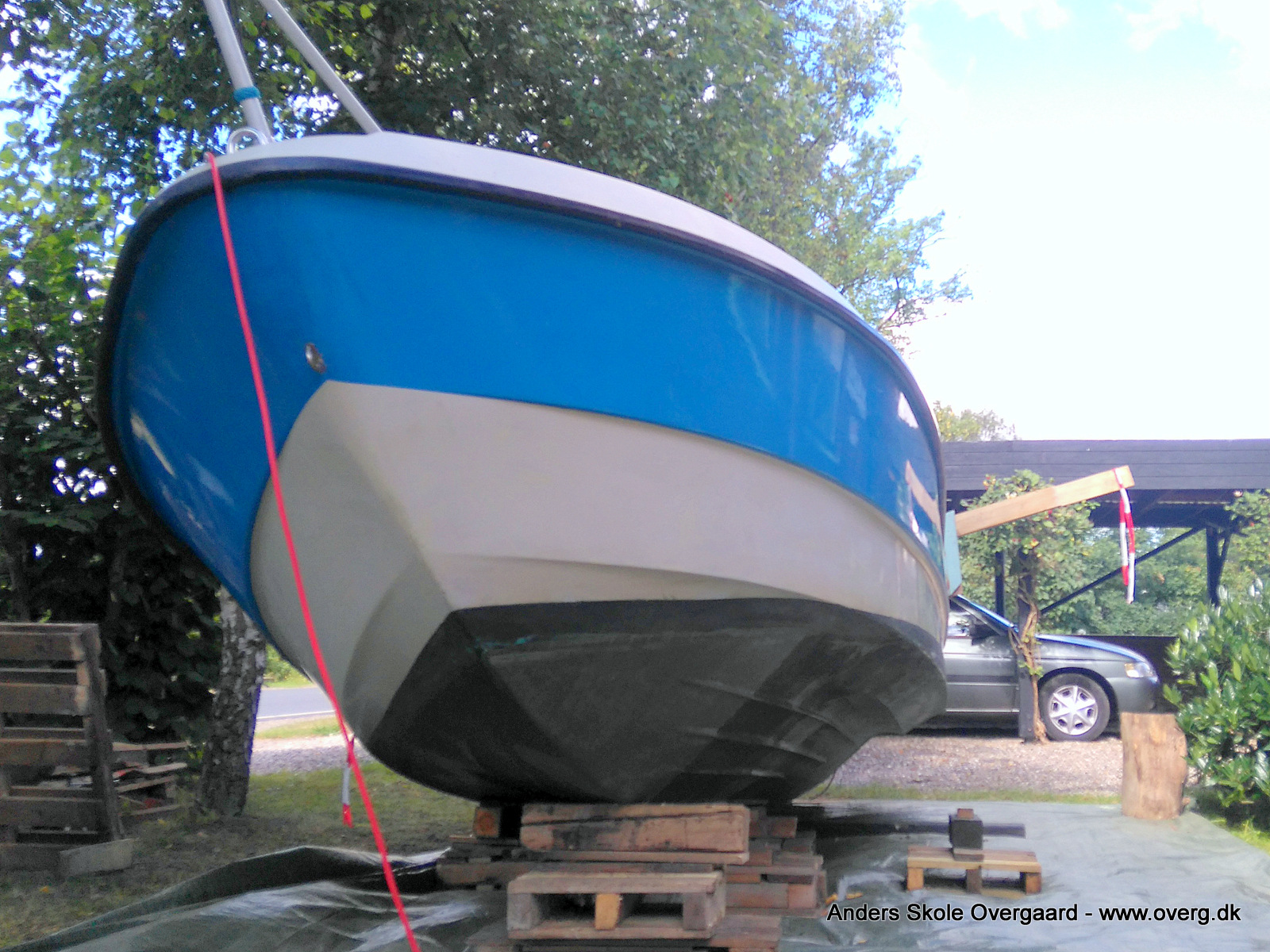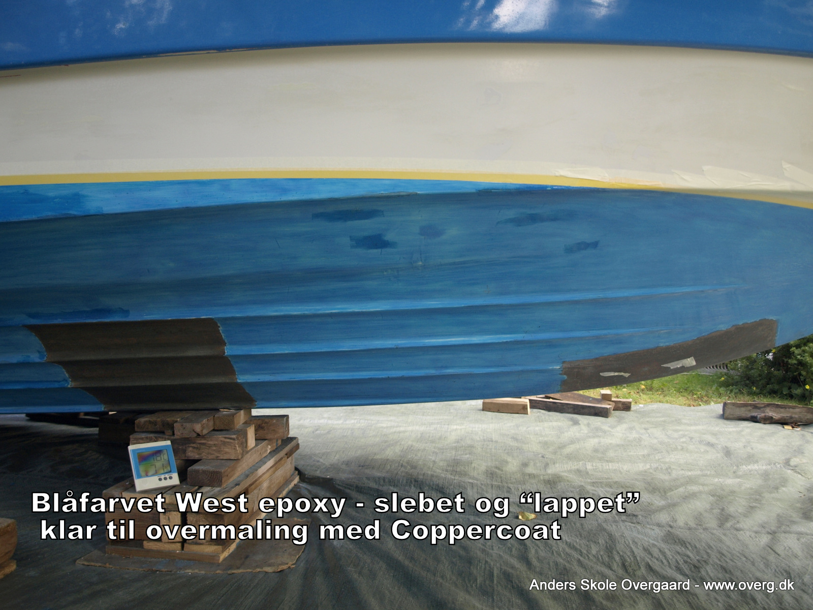 Det betød, at jeg rensede 3 felter helt i bund, og fulgte fabrikantens anvisninger med en West Epoxy som ”primer” (med lidt blå farve) + 4 lag Coppercoat. Det blev søsat forår 2014.