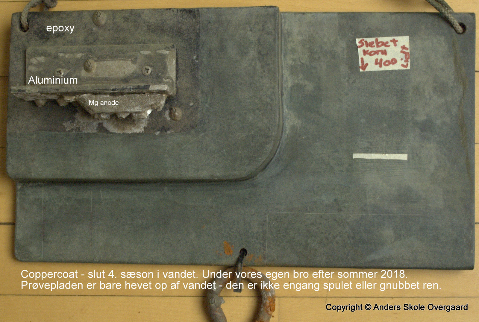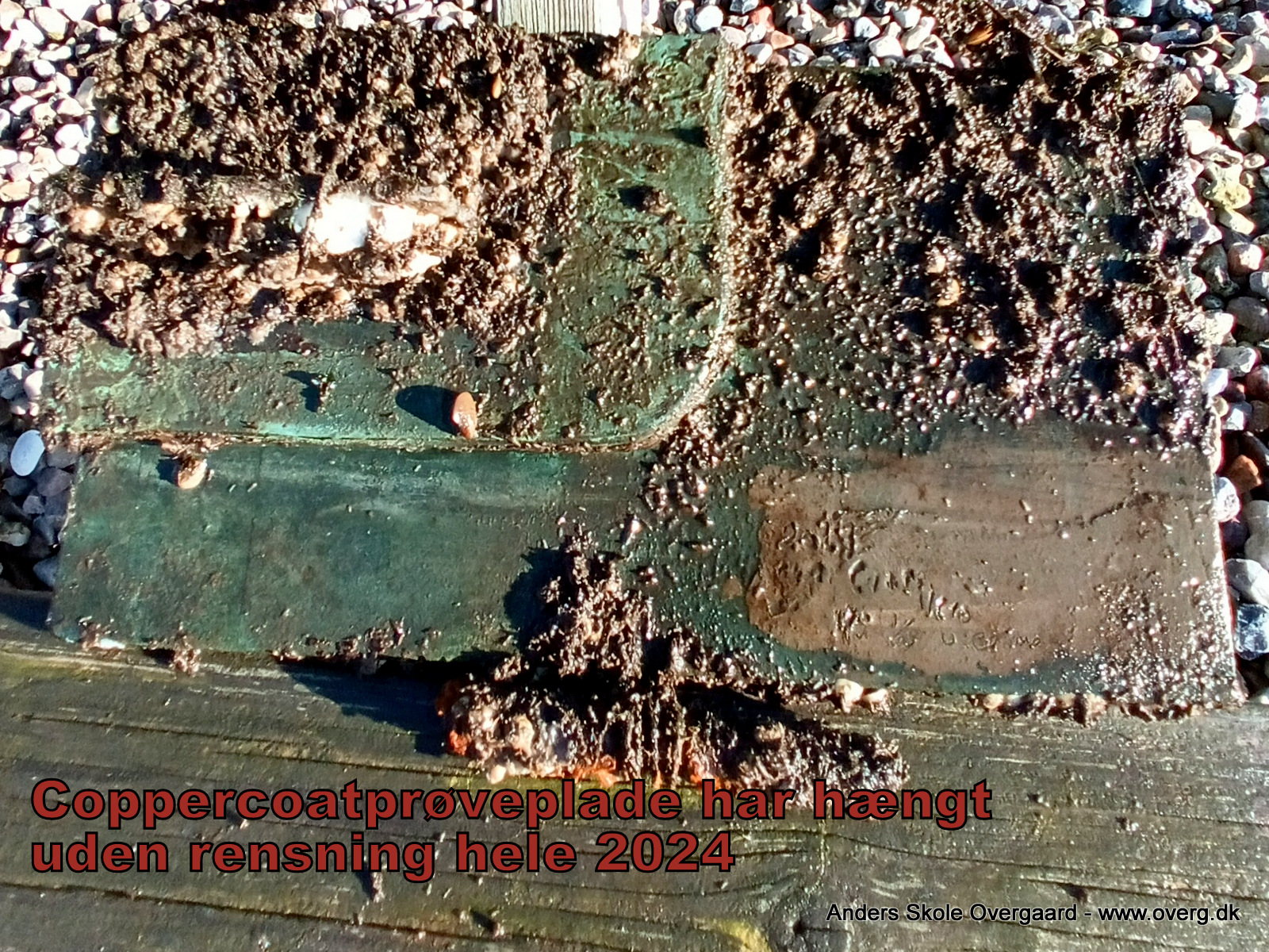 Jeg lavede jeg også ”Prøveplade”, til at hænge i vandet under vores egen bådebro. Det skulle være en “Prøveplade”, som jeg kunne tjekke løbende for begroning.