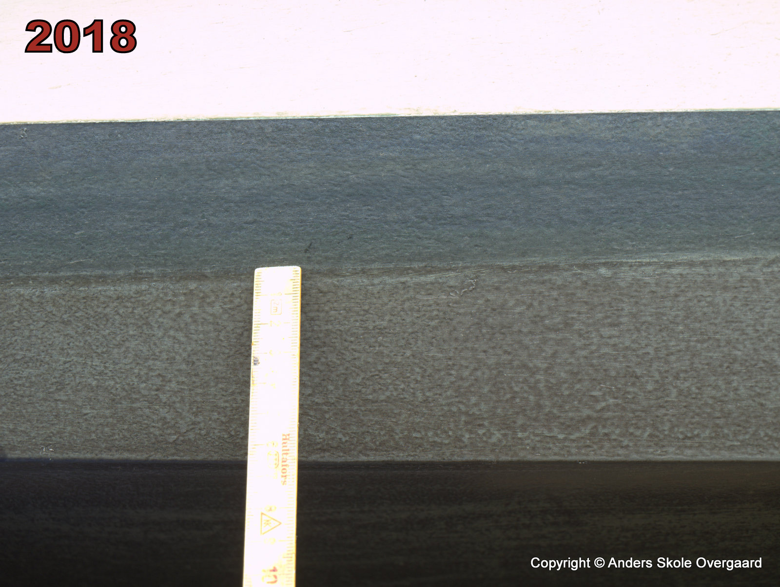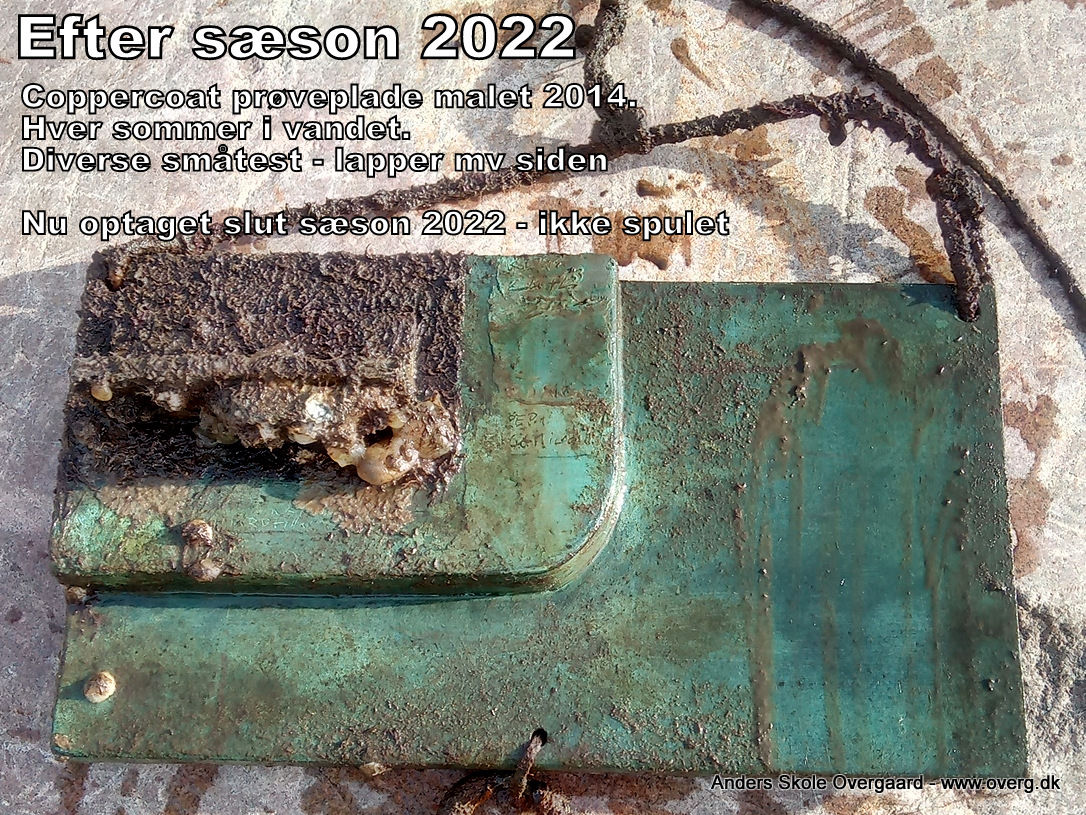 Denne prøveplade har jeg hængt under bådebroen, hvert eneste år samtidigt med at båden har været i vandet – siden 2014.