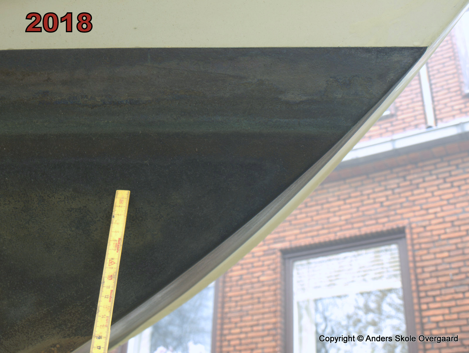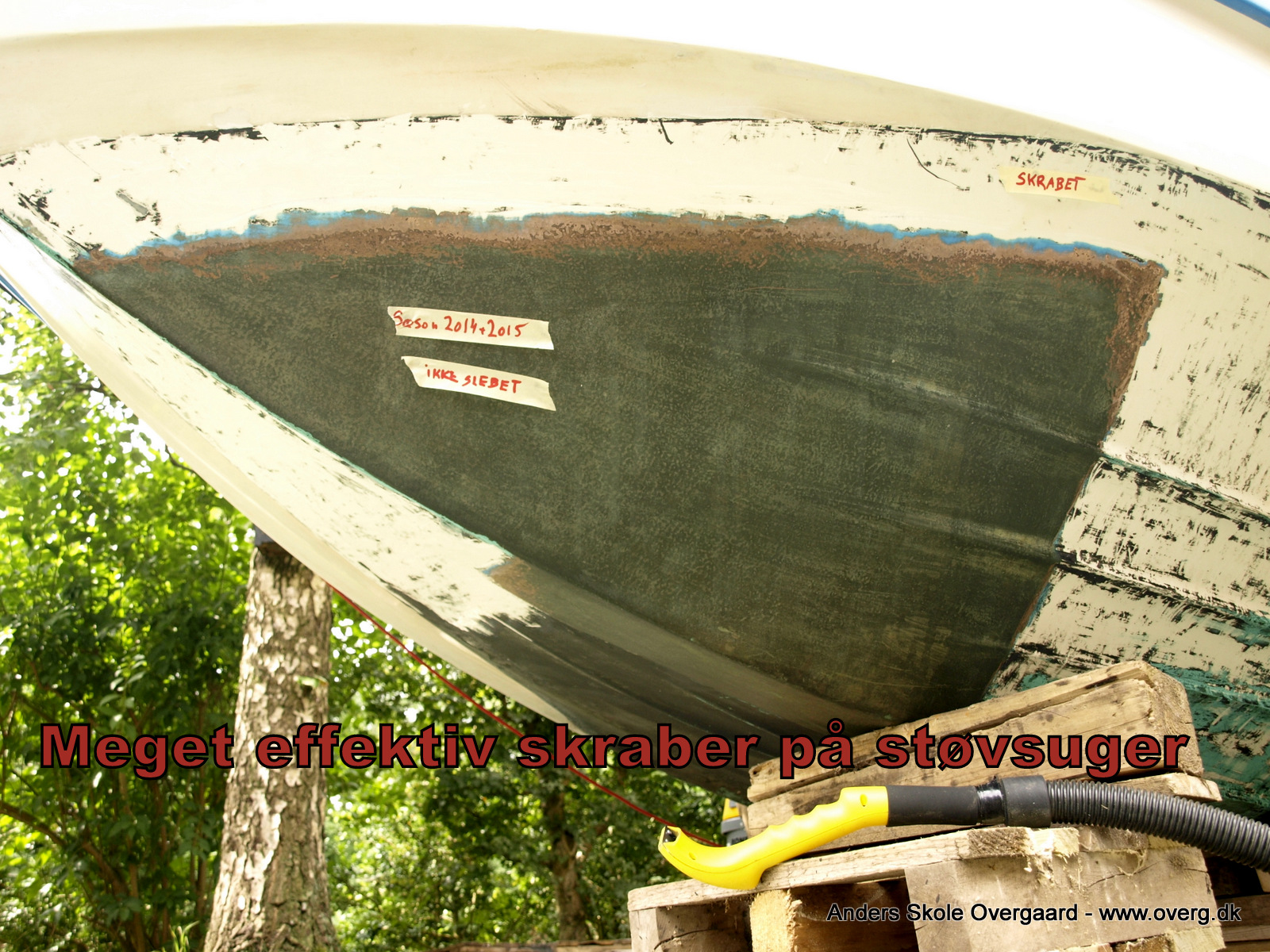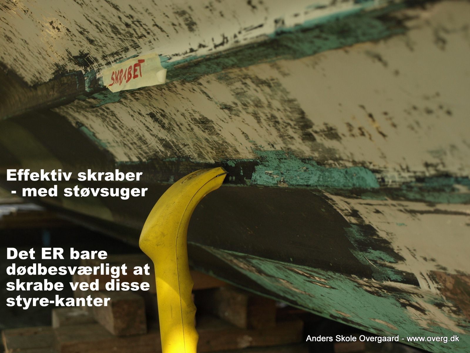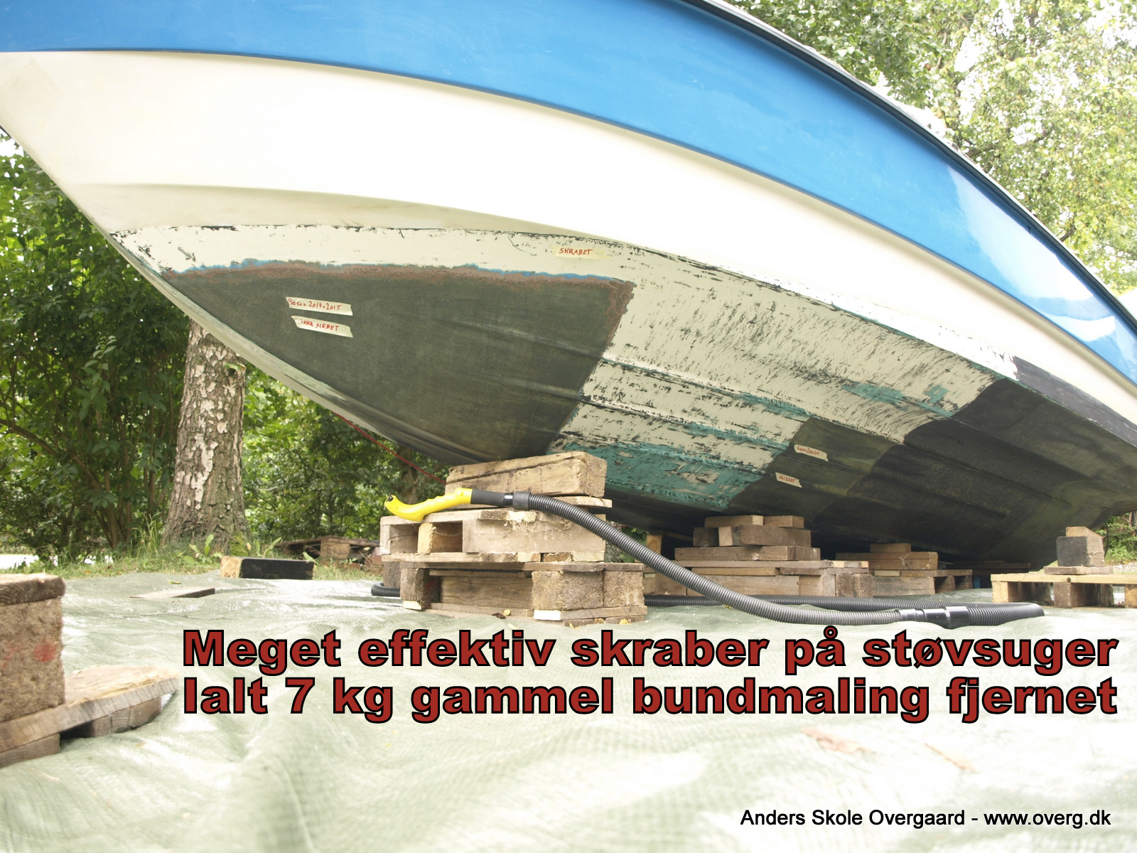 Skrabearbejdet var effektivt med en ”vacuum skraber” med hårdmetal platte med AFRUNDEDE HJØRNER” og industristøvsuger. Vægten af den AFSKRABEDE bundmaling var 7-8 kg !!!!