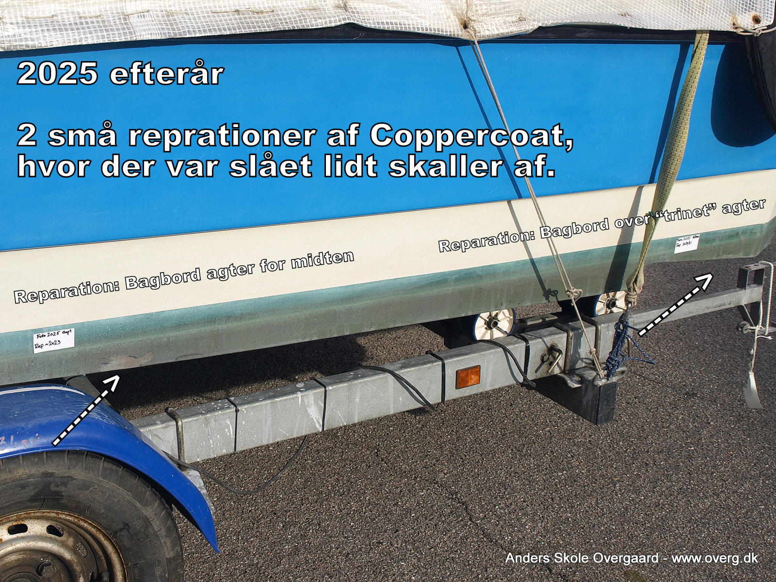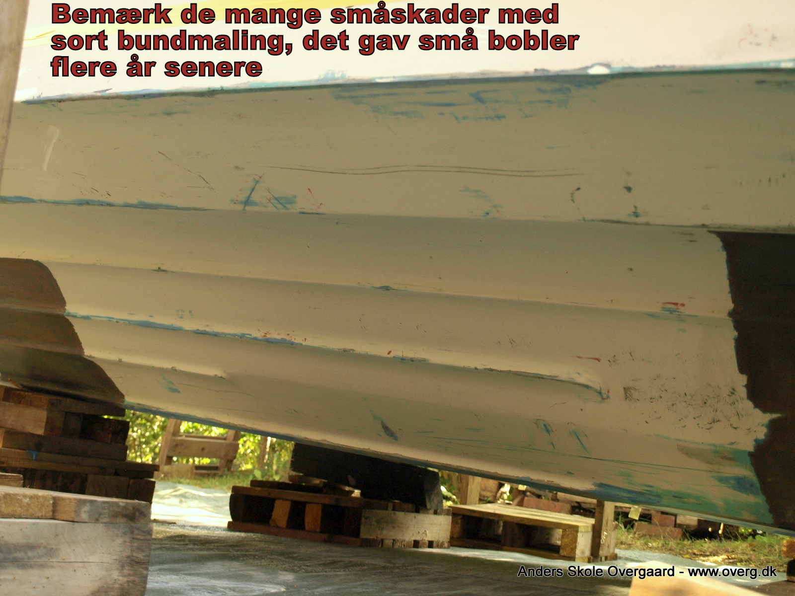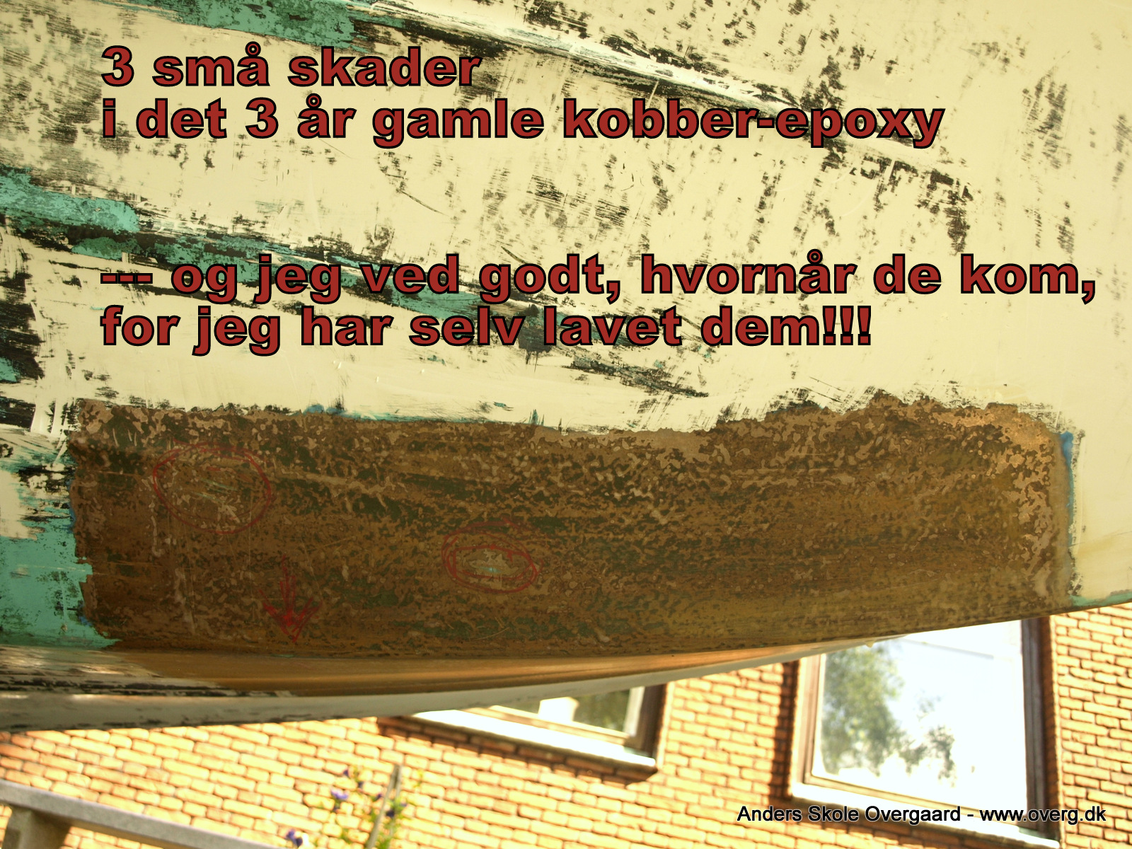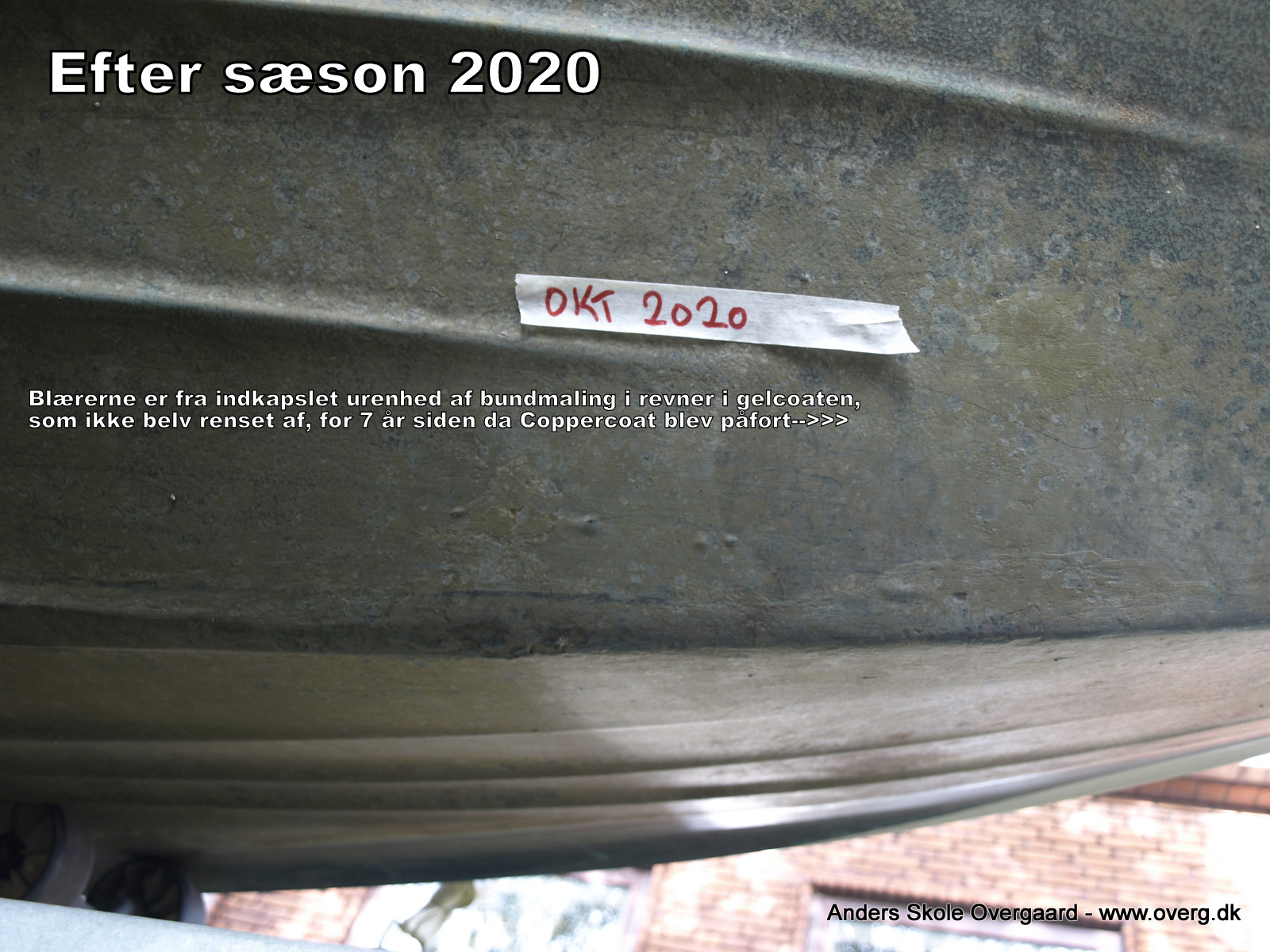 Efter nogen år kom der små blærer, hvor gelcoaten IKKE var blevet renset totalt inden maling med Coppercoat. Derfor skal jeg NU slibe og reparere “frimærkestore” skavanker en gang imellem.