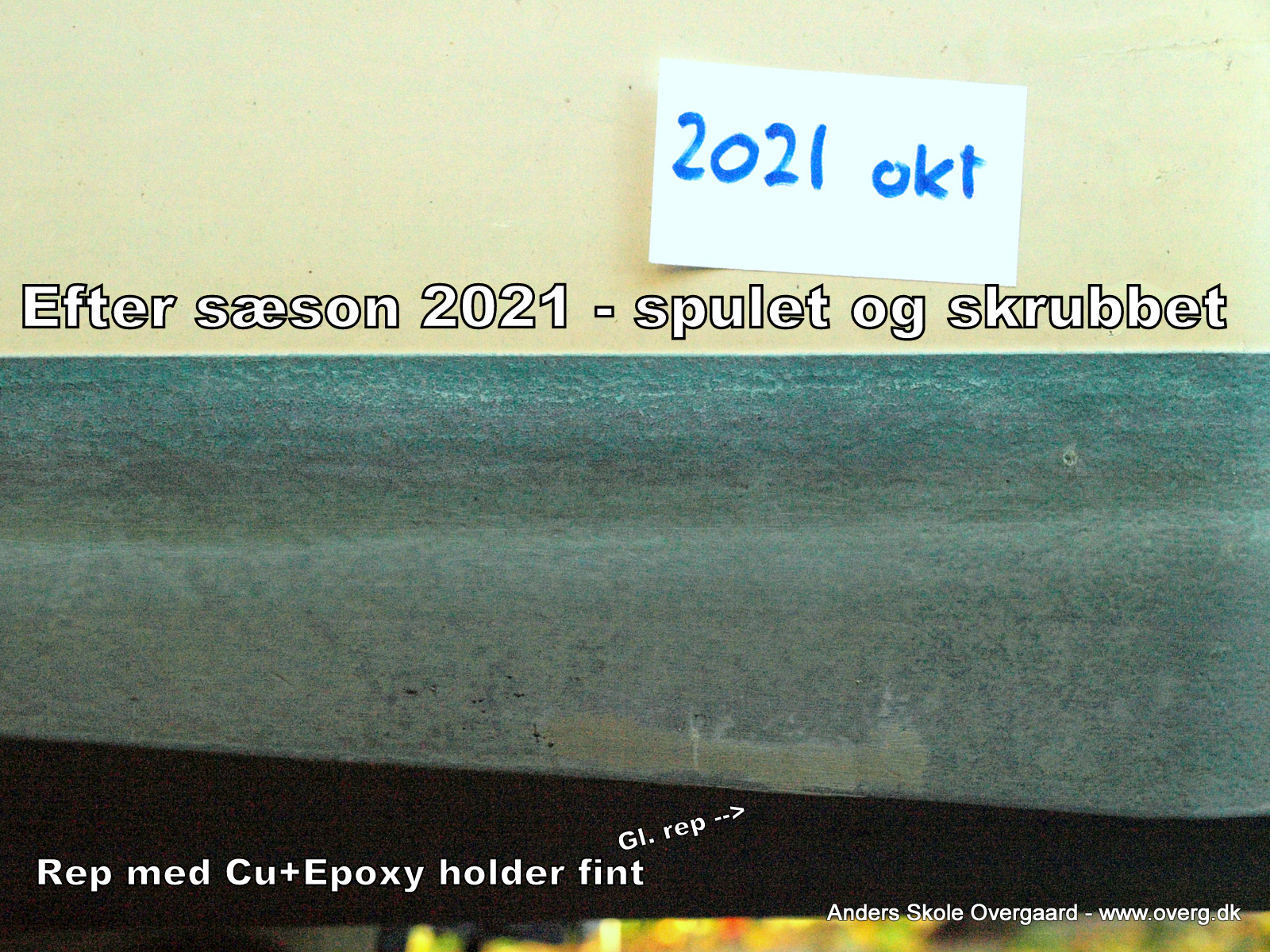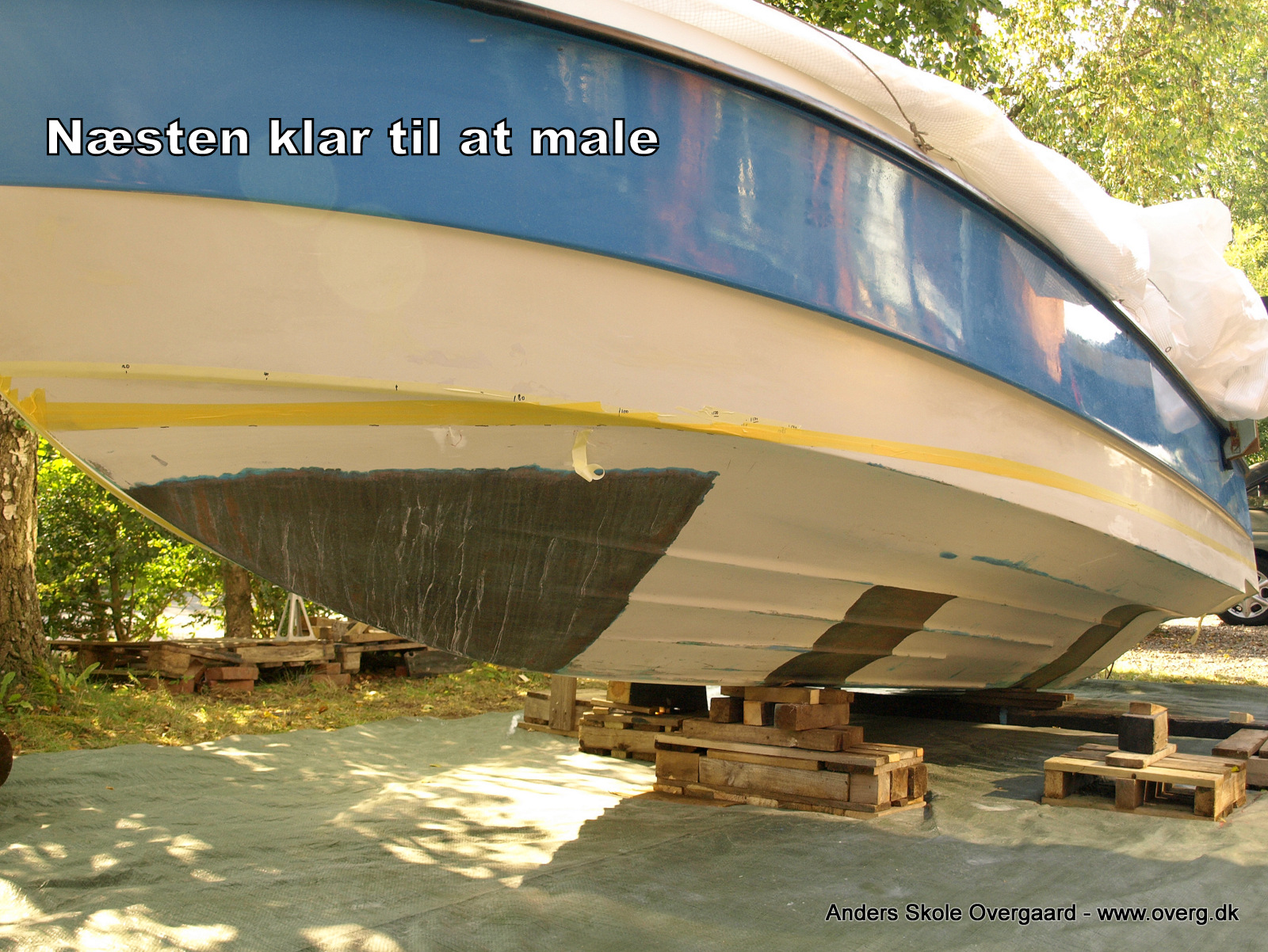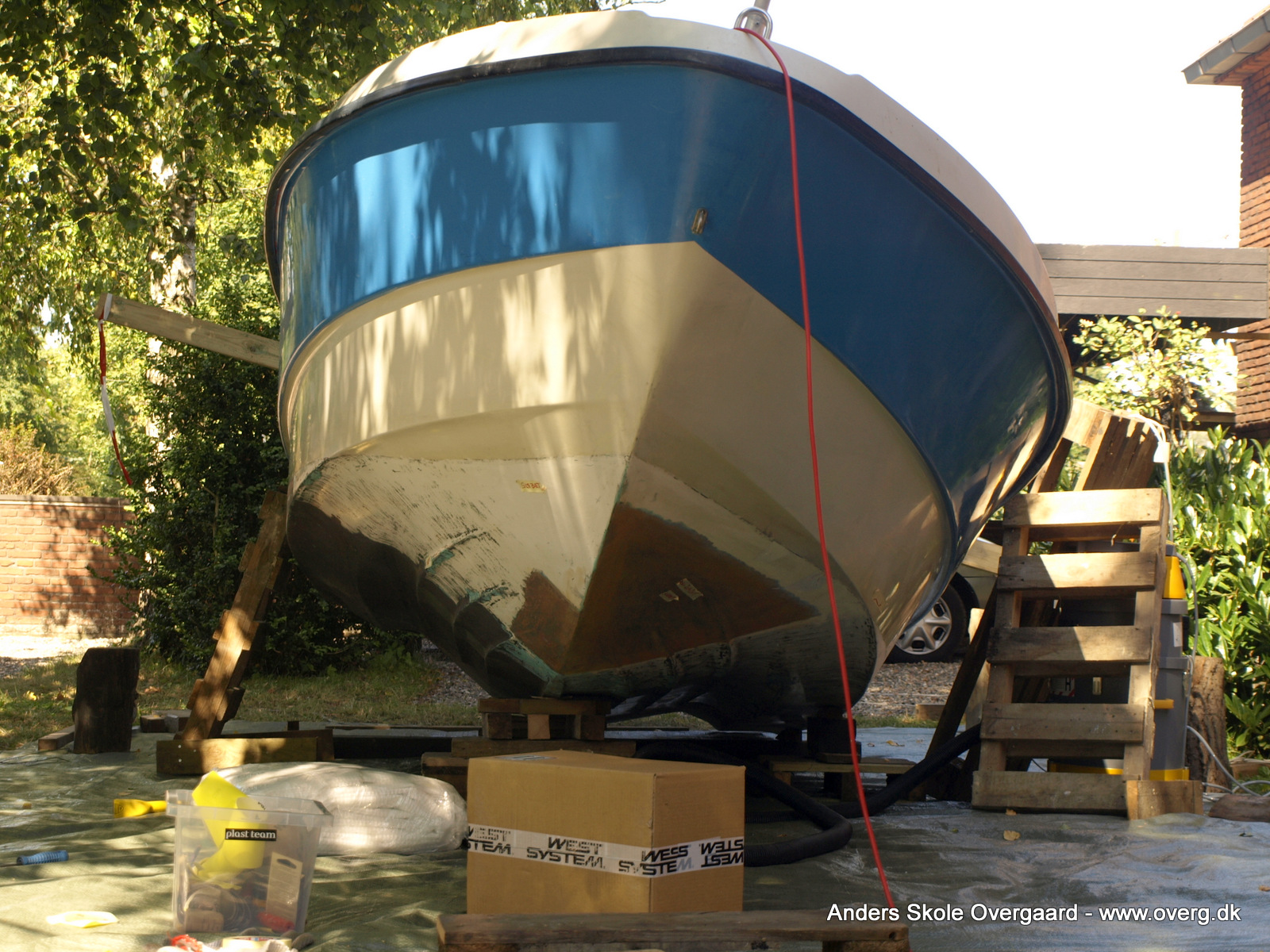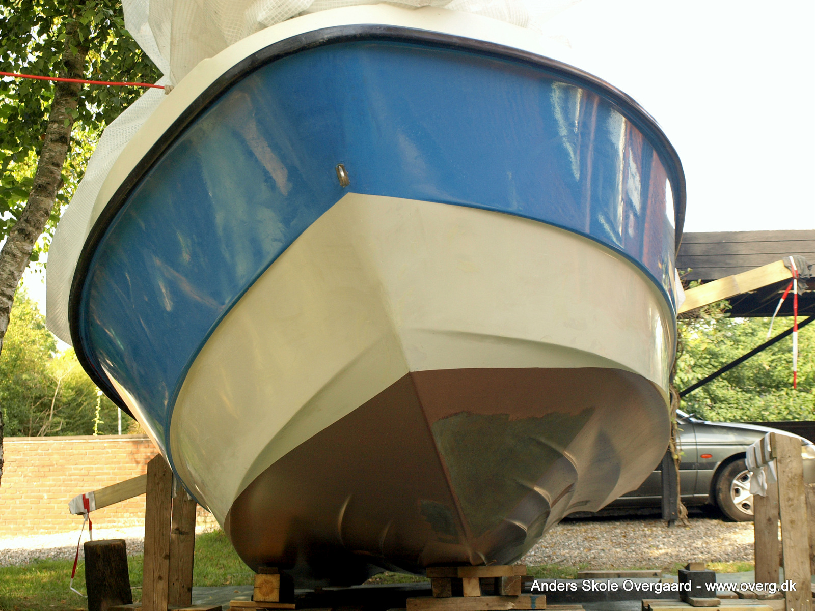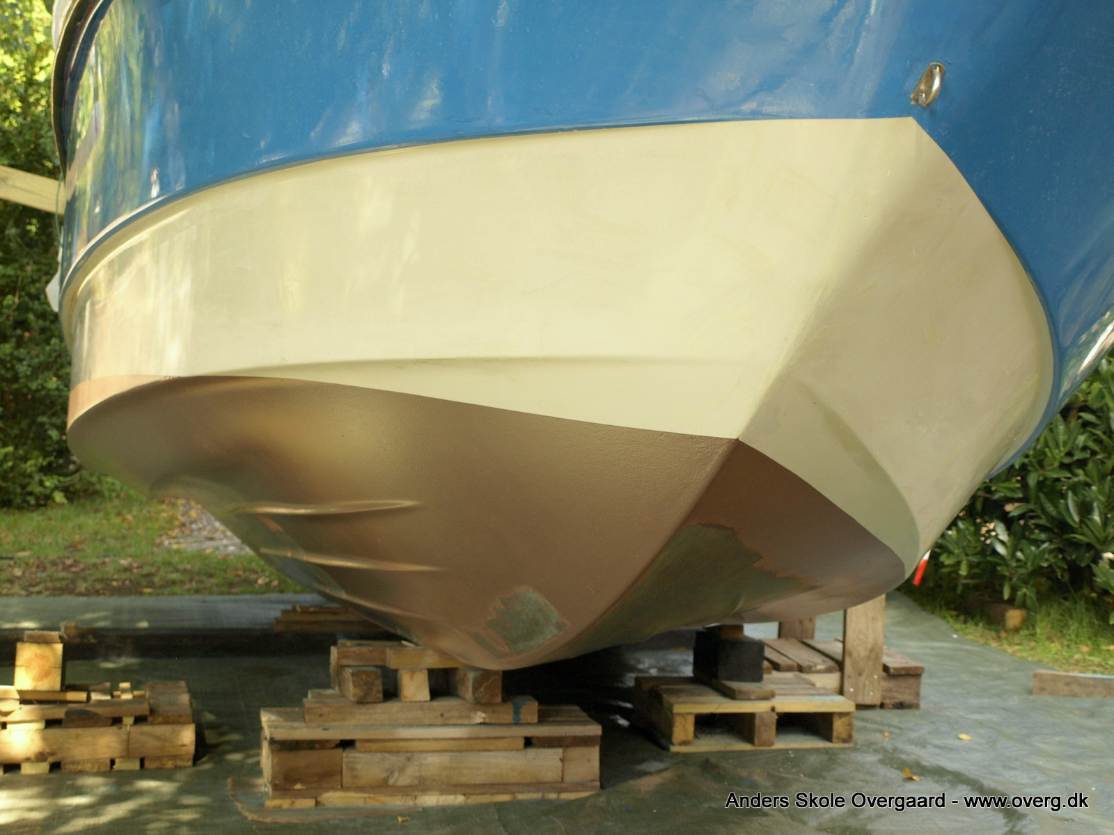 Efter nogen år kom der små blærer, hvor gelcoaten IKKE var blevet renset totalt inden maling med Coppercoat. Derfor skal jeg NU slibe og reparere “frimærkestore” skavanker en gang imellem.