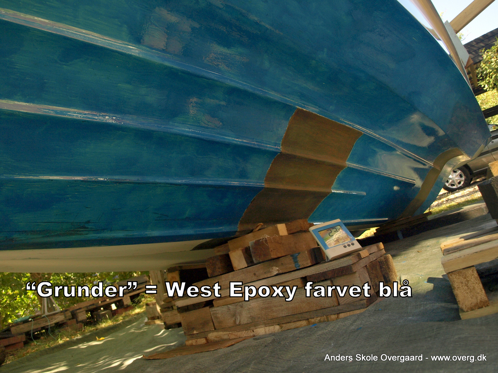 Derefter skal bunden have en “primer” af West Epoxy, som jeg har givet en blå farve.