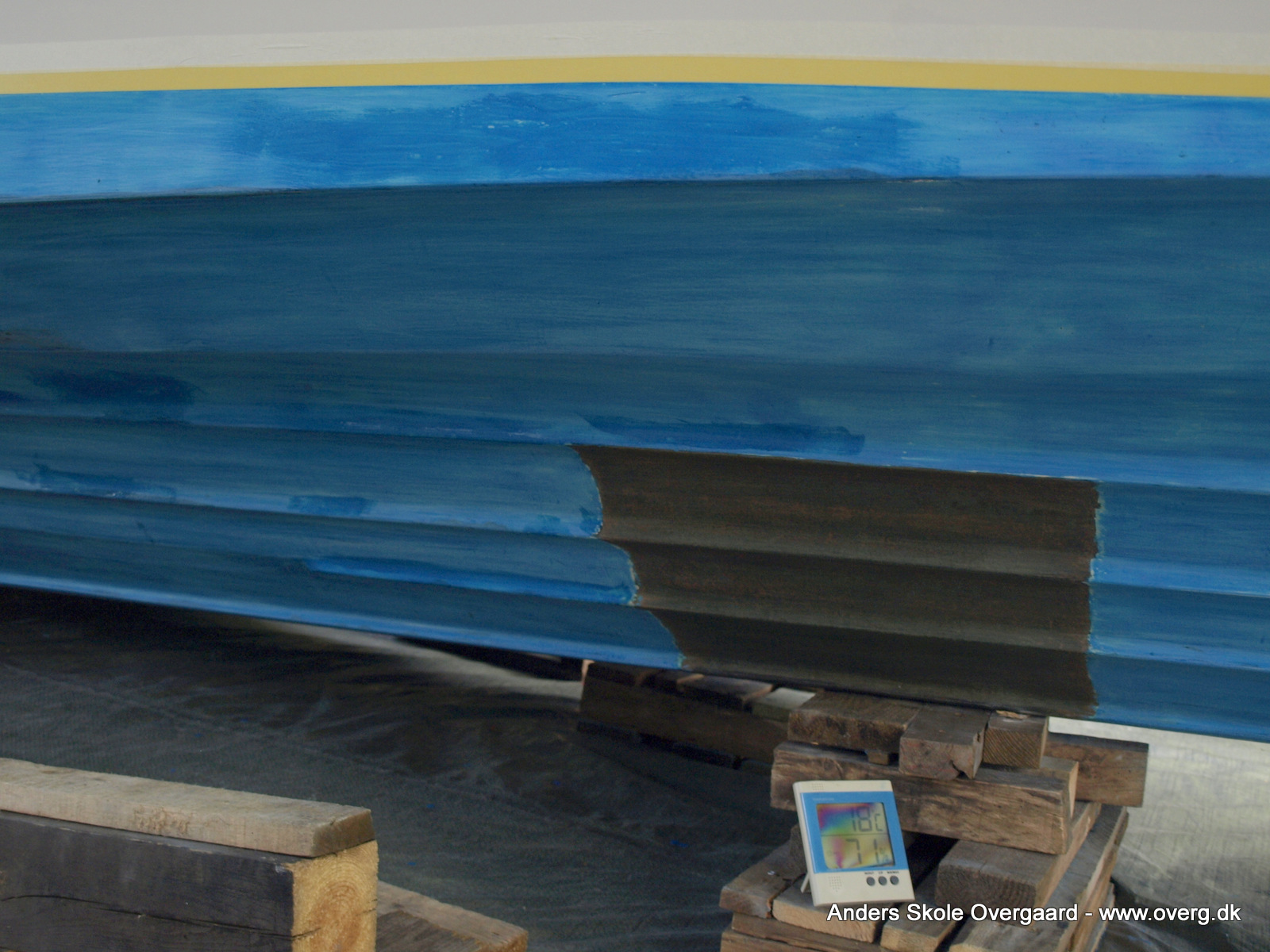 For at være på den sikre side, malede jeg 3 ”forsøgs-felter” under båden i foråret 2014.