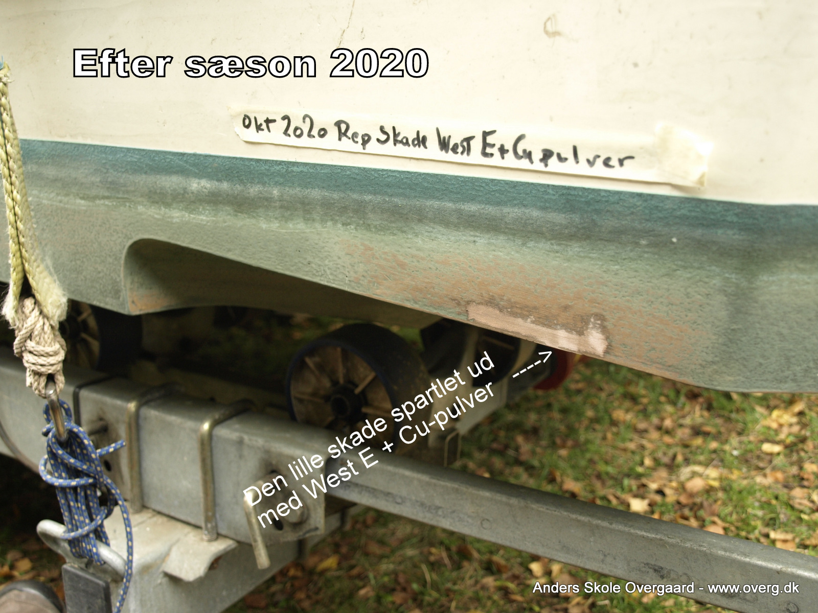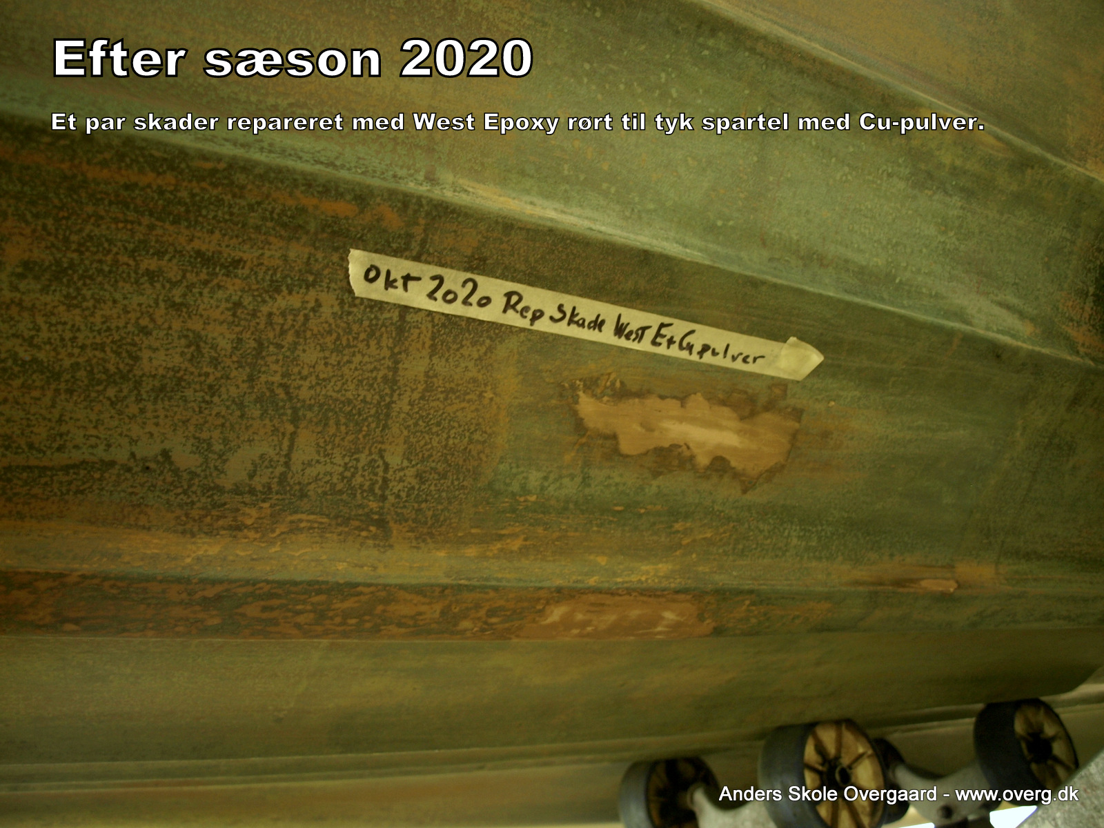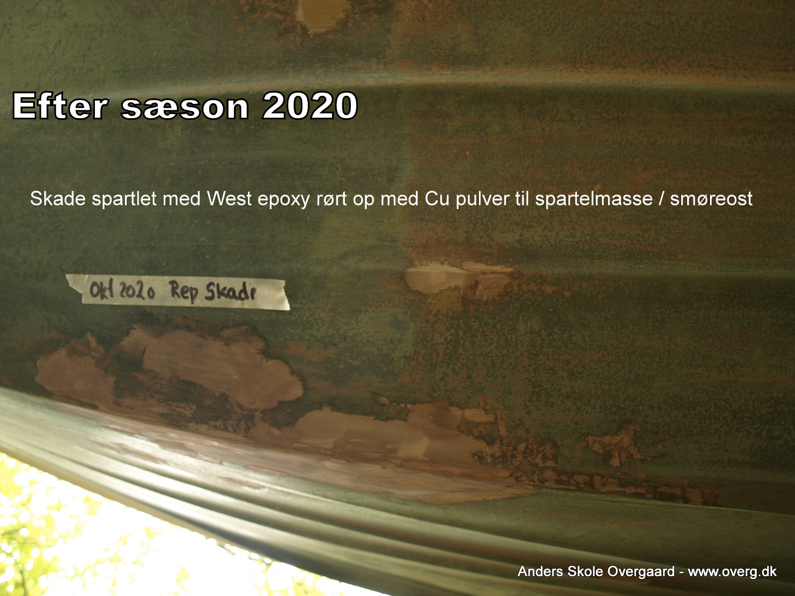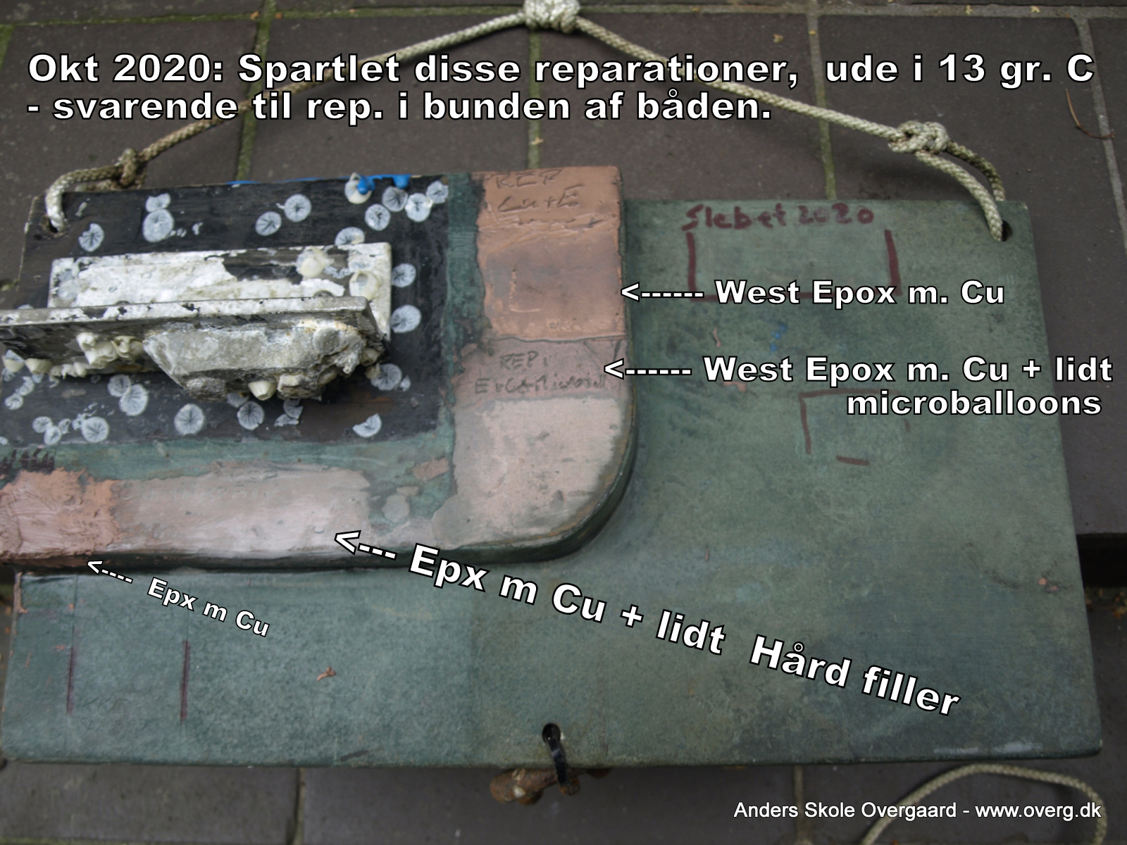 Jeg beskriver en hurtig reparation til mindre skader: En ”smøreost-spartel” af West Epoxy og kobberpulver. Lægges på i kun 2 trin.