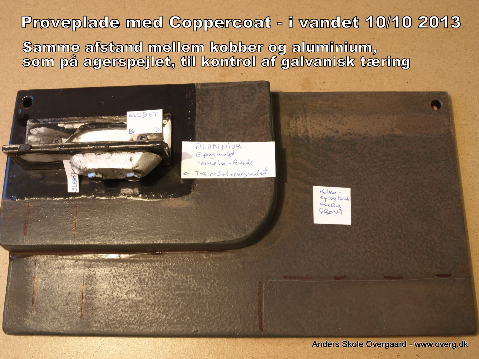 Prøvepladen skulle også afsløre, om der var problemer med galvanisk tæring på grund af kobber, som jo kun er 3 centimeter fra Aluminium Motorben på båden.